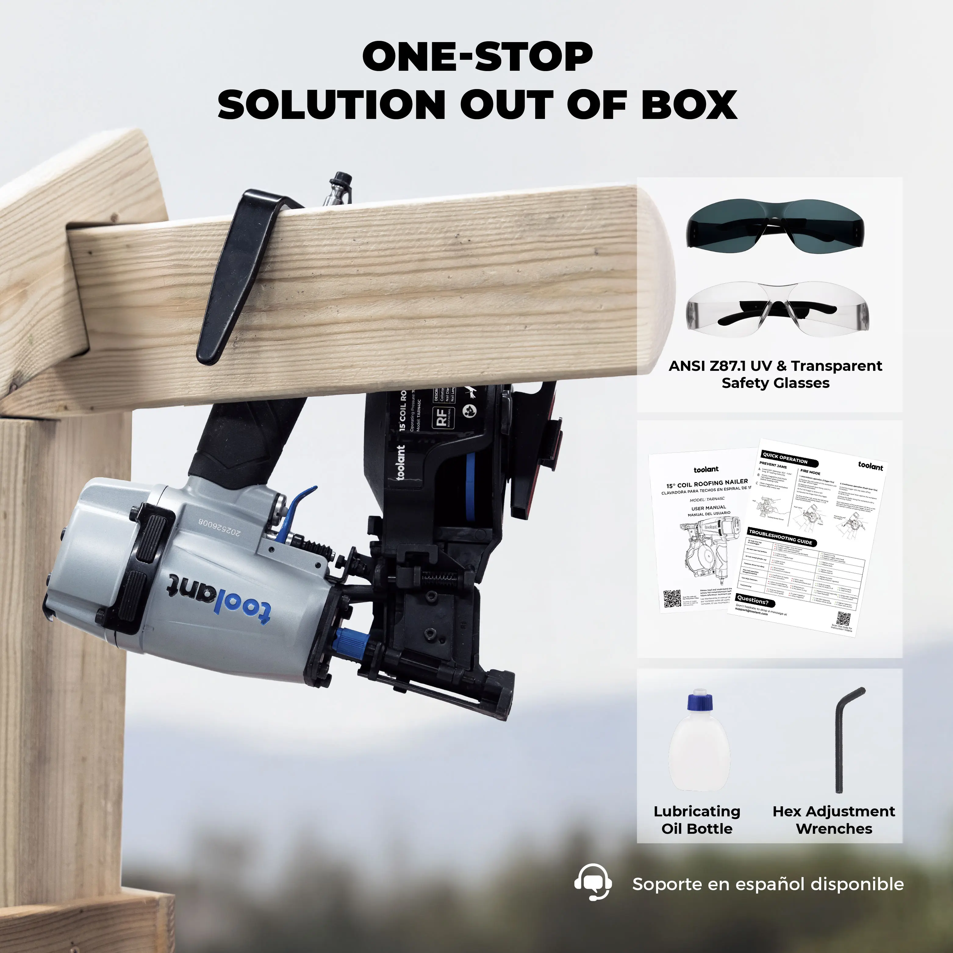 Works with 3/4” to 1-3/4” 15° wire coil nails, the standard for most roofing. The universal 3/8” air inlet fits most compressors. Suitable for siding, fences, metal flashing, wood siding, or asphalt shingles. Versatile for diverse applications.