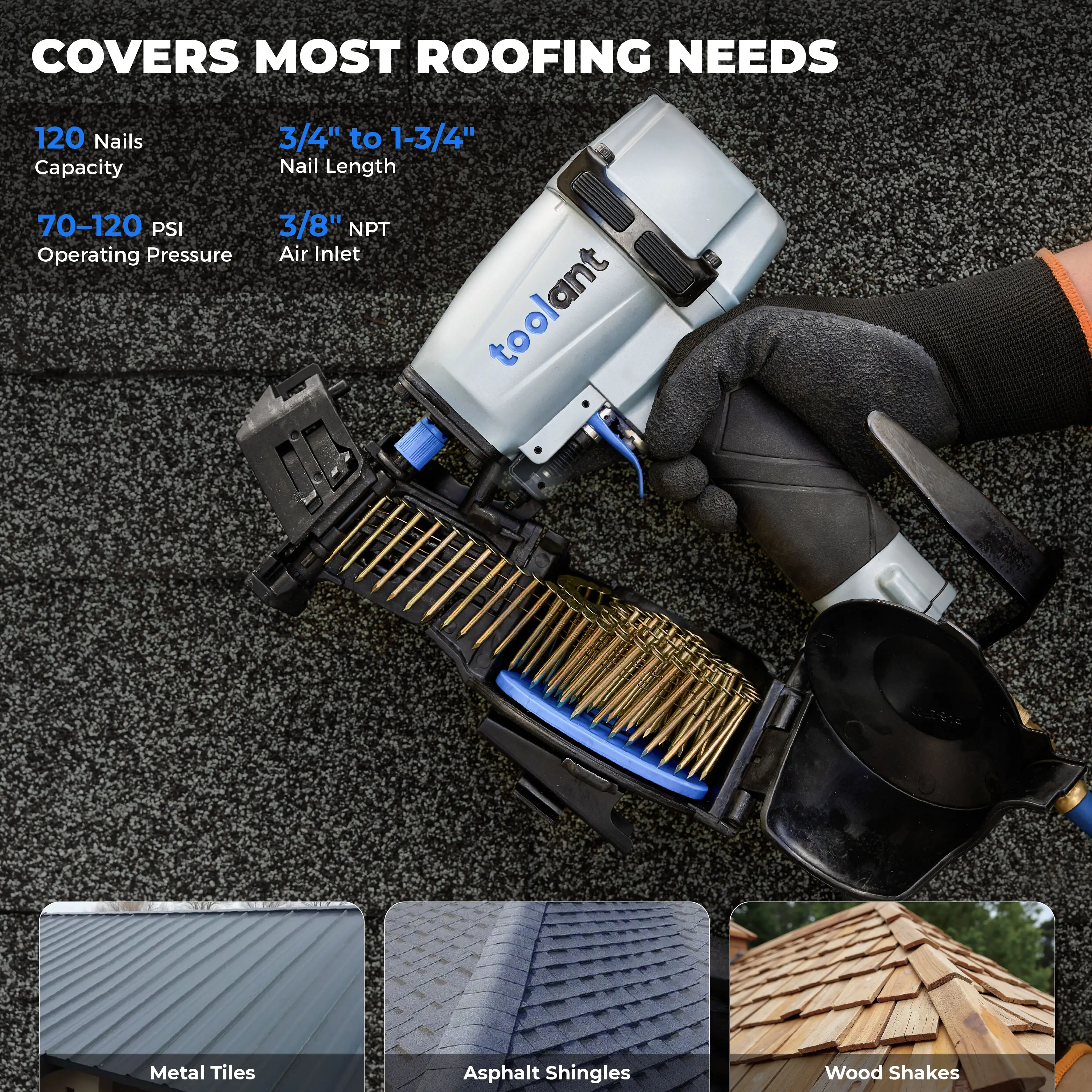 This pneumatic roofing tool drives up to 3 nails per second with no jams. The 120-nail coil and 70–120 PSI working range ensure speed. Each nail sinks clean, smooth, and flush. Less rework, better-looking shingles, and more time for the next job. Ideal for professionals and DIY enthusiasts.