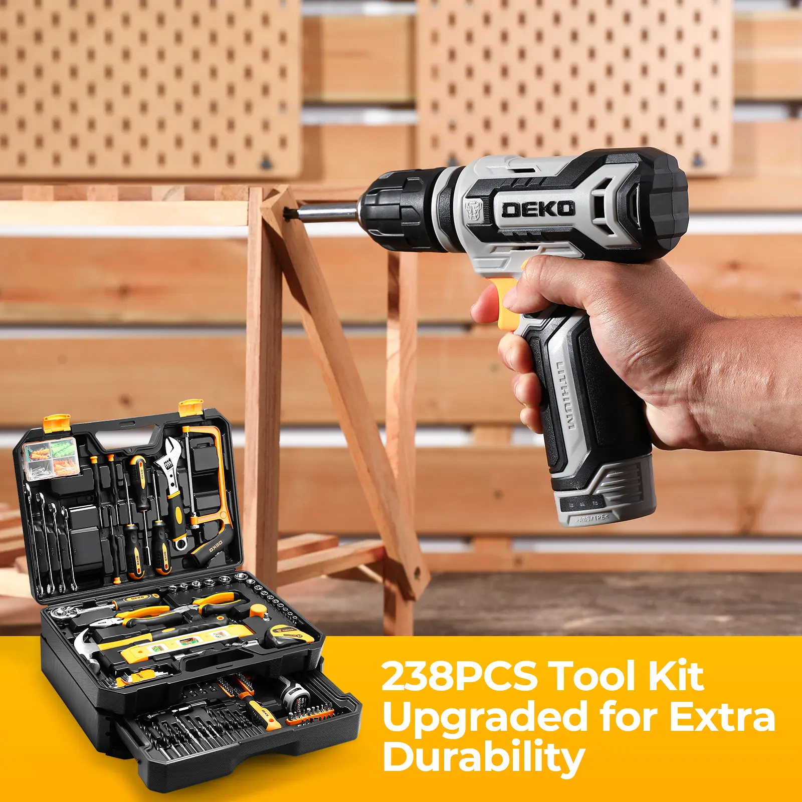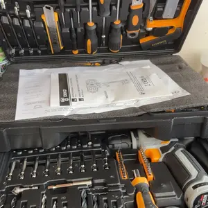 A 238-piece toolkit with essential tools: cordless drill, screwdrivers, wrenches, and more. Ideal for home repairs and DIY projects. Perfect for homeowners, mechanics, and craftsmen. / Juego de herramientas de 238 piezas para reparaciones del hogar y proyectos de bricolaje.