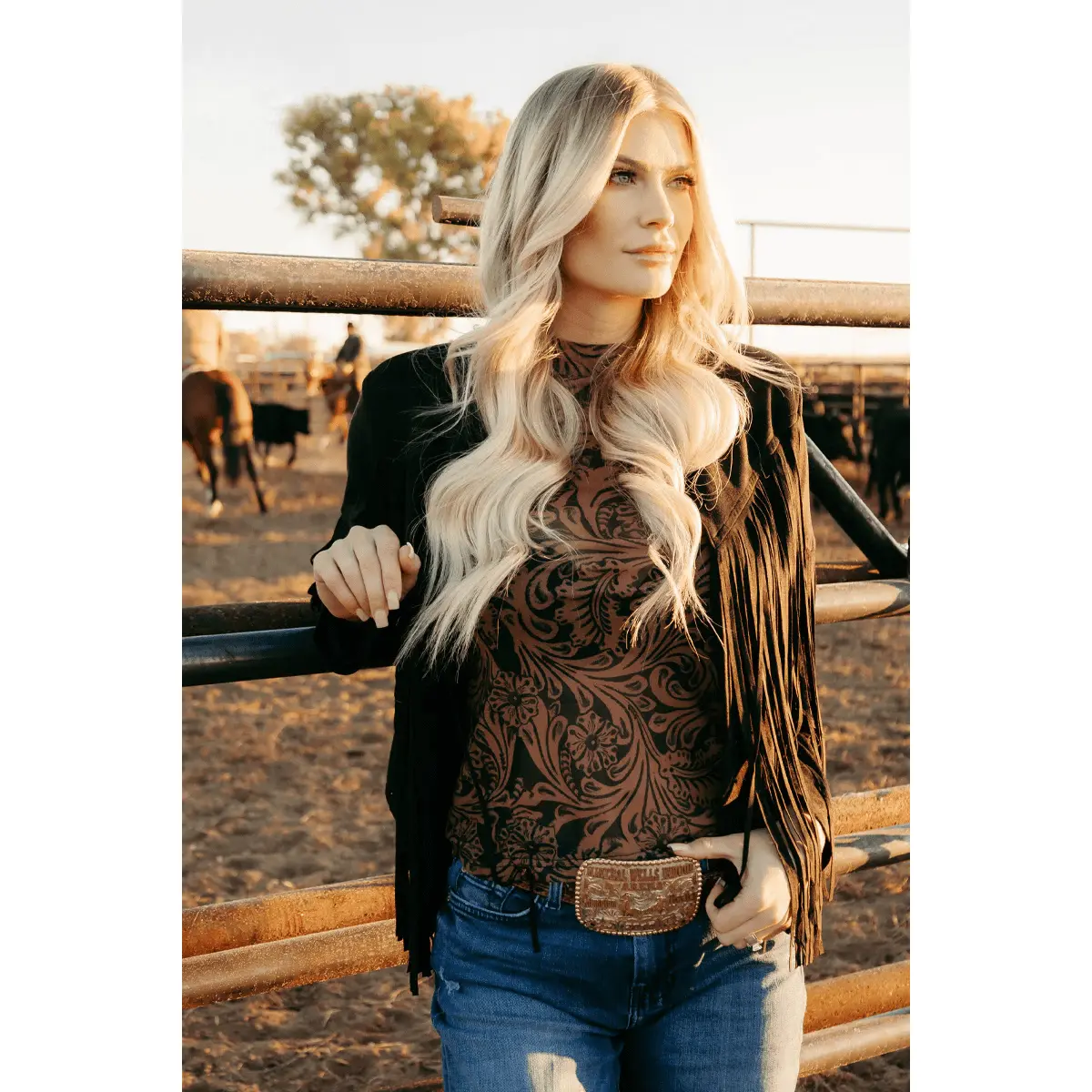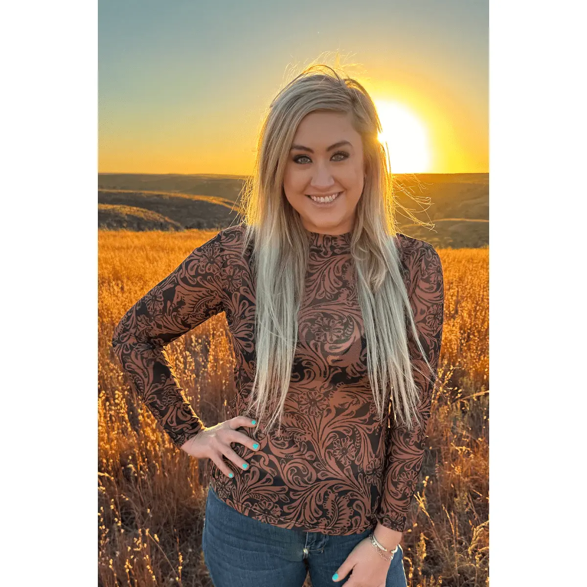 Country Road Tooled Leather Mesh Top #fulllengthtops #cowgirloutfit #leathertop #denimtop #womentops #trendytops #cowgirlbootsoutfit #womentop #topsforwomen #summergoingouttops