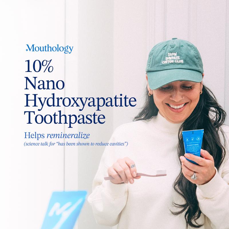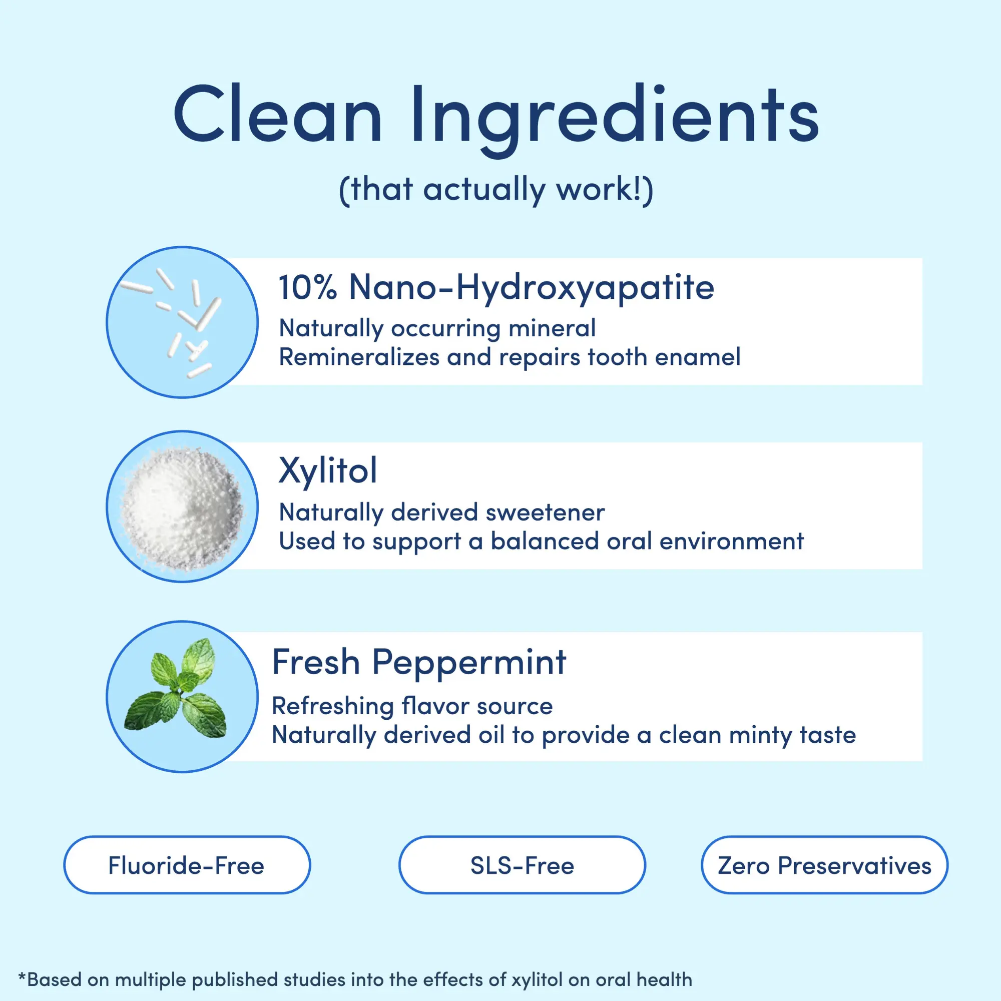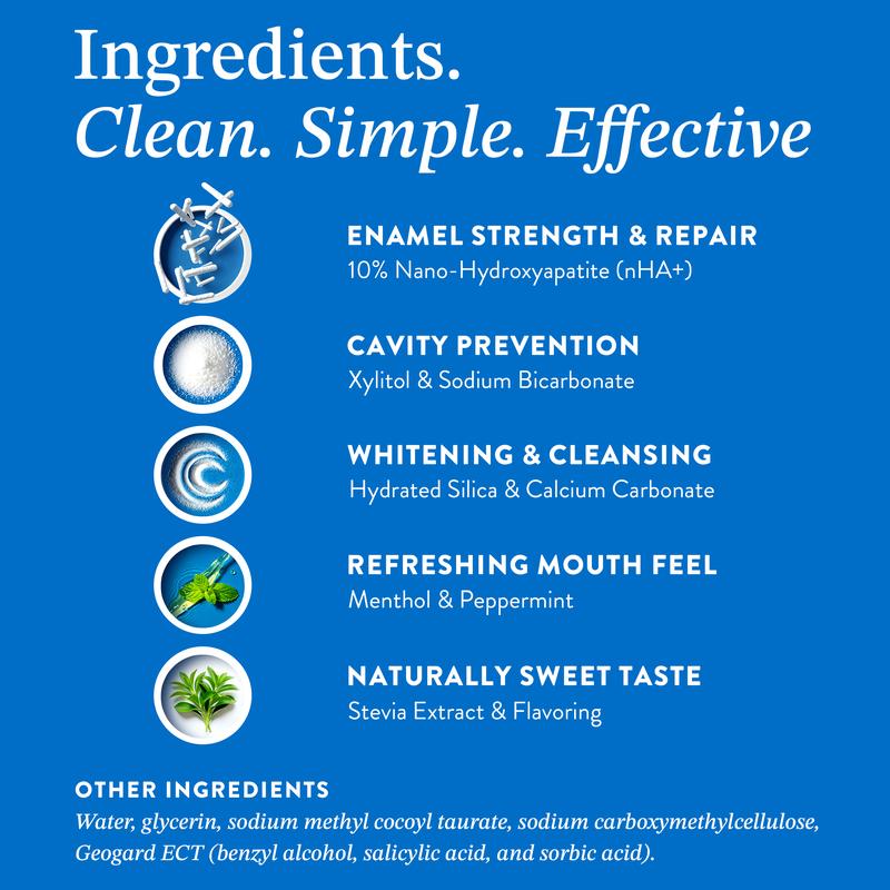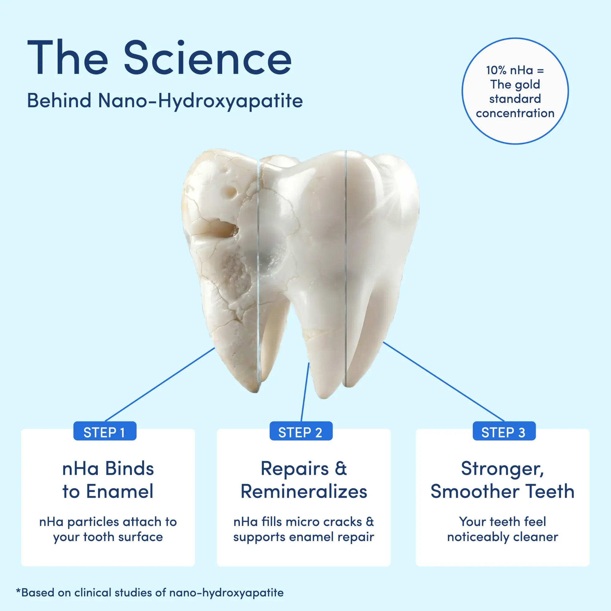 ·THAT CLEAN DENTIST FEELING: Say goodbye to harsh bleaching agents. Our nano hydroxyapatite toothpaste gently polishes, leaving you with a glossier, smoother "tooth feel" without causing sensitivity.