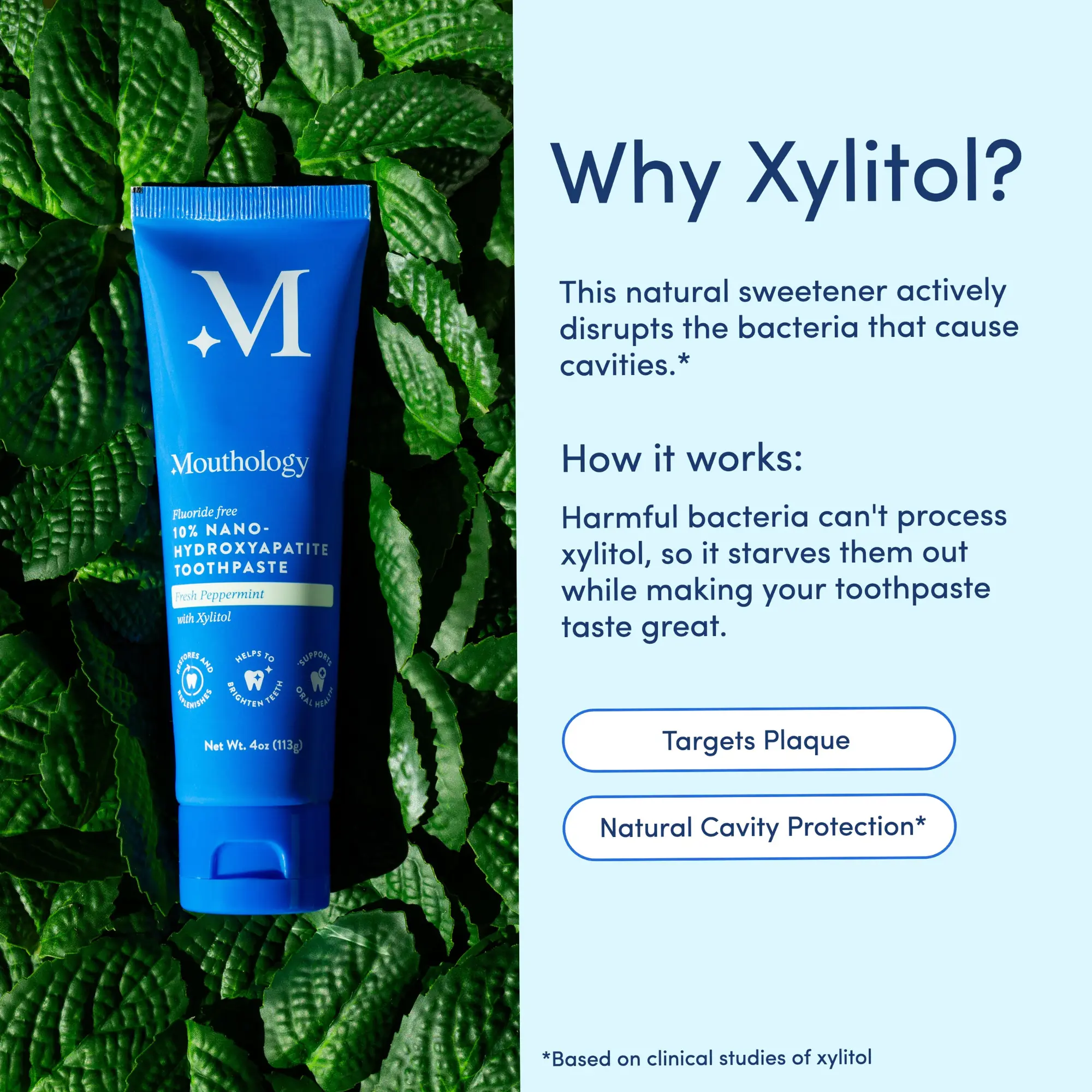 ·10% NANO-HYDROXYAPATITE: Our toothpaste features 10% nano-hydroxyapatite (n-HA), a calcium-based compound used in Japan for decades in oral care. Known for its smooth feel and gentle cleaning, n-HA is an alternative to fluoride for those who prefer fluoride-free options. n-HA is a remarkable biomaterial that comprises 60-70% of bone mass and an astounding 96% of tooth enamel, making it the hardest substance in the human body.
