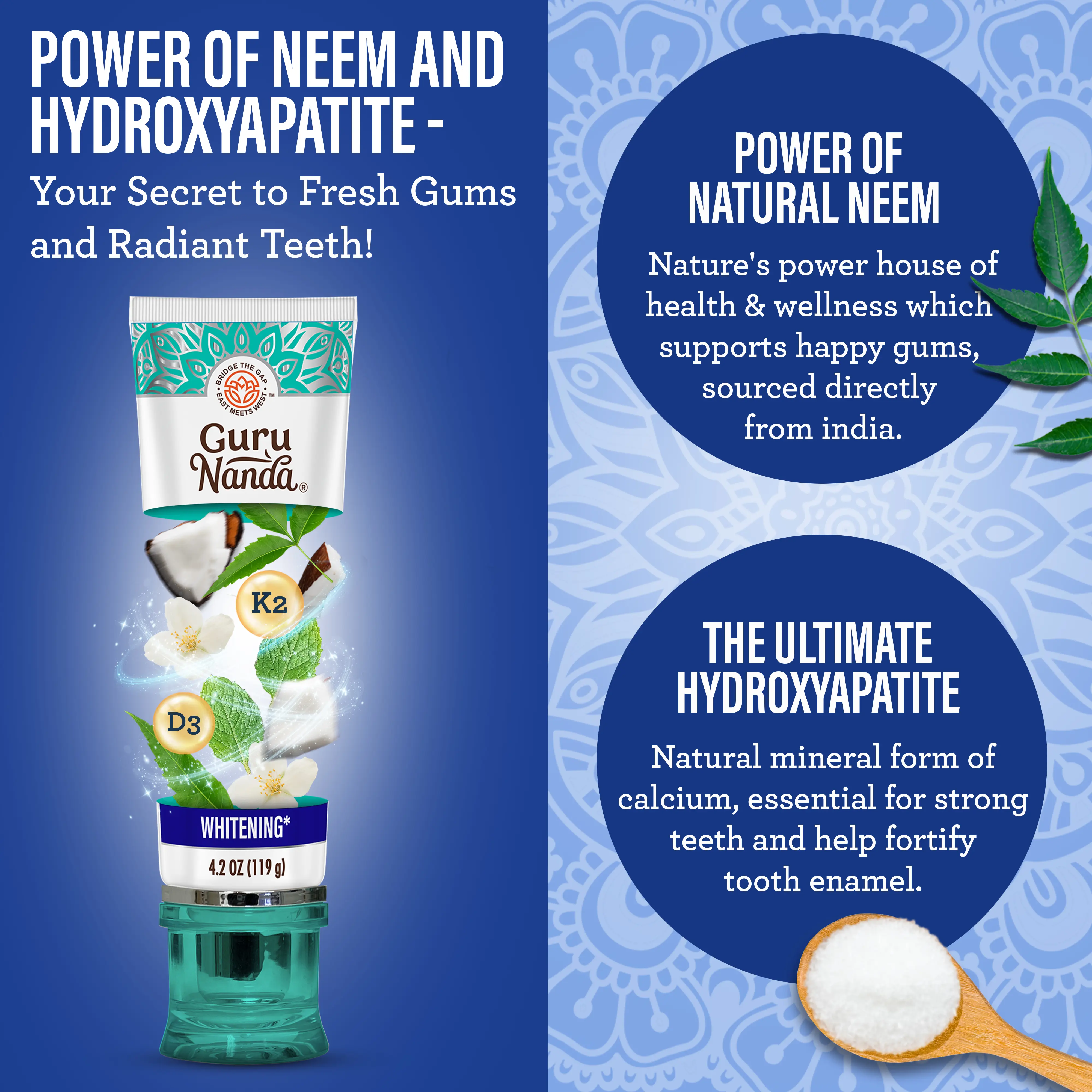 FLUORIDE-FREE HYDROXYAPATITE TOOTHPASTE: GuruNanda Neem Hydroxyapatite Toothpaste is fluoride-free and SLS-free. It fights plaque, supports sensitive teeth and gums, and promotes oral hygiene, helping you achieve a healthier, brighter smile.