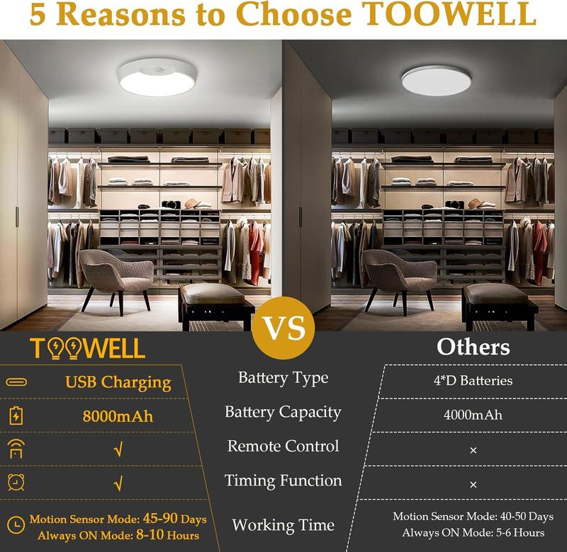 Upgraded 8000mAh Rechargeable Battery - No need to buy batteries! Our rechargeable motion sensor ceiling light features a upgraded 8000mAh rechargeable battery which lasts longer than other motion-activated lights. Also this wireless LED closet light can be charged via USB cable(Type-C charging port included). Less than 8-hour charging, the light can provide up to 10 hours under stay ON mode, even 45-90 days lighting under sensing mode