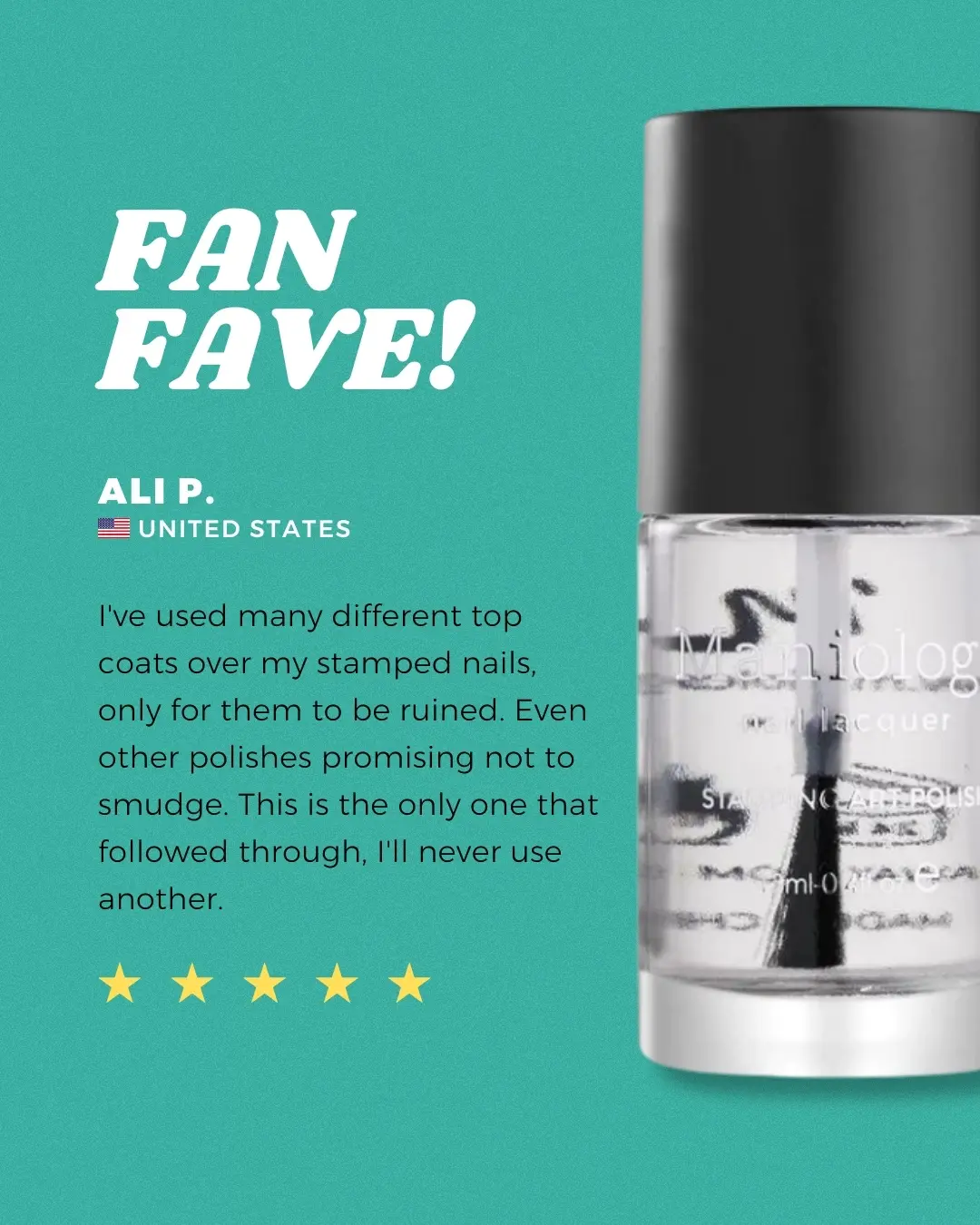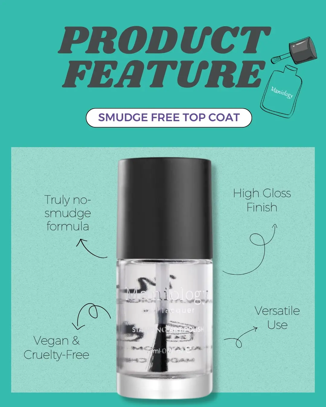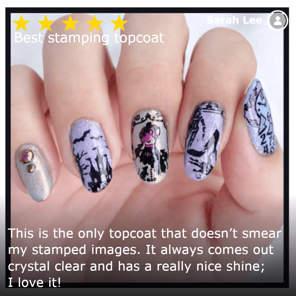 Seal in your nail art with our Smudge Free Top Coat. Whether it's just a basic color, nail stamping patterns, nail foils, or mirror finished chrome/holo powders, this top coat won't smudge, crack or dull any design you have just slaved over. This one is a Must Add to your nail polish collection!