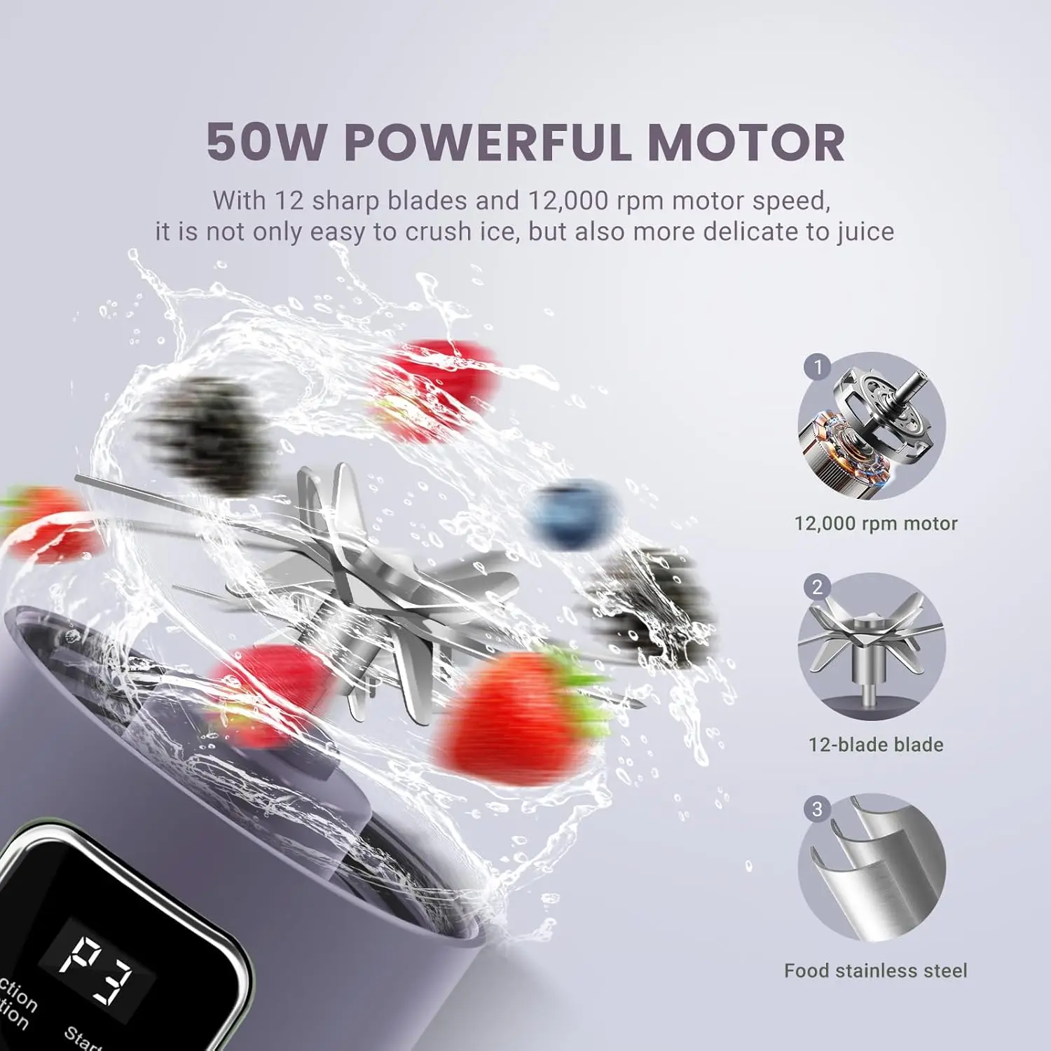 ¡ăSafety & Food-Grade 12 Blades ăOur Portable juicer made of high-quality food-grade, non-toxic ABS and 304 stainless steelFeatures an elegant hand-held M-cup lid design that not only looks beautiful but also allows for easy disassembly of the cup and machine.Features a robust 50W motor and 12 stainless steel blades spinning at 12,000 RPM.It can easily crush ice cubes and frozen fruits.Elevate your blending experience with convenience and speed.