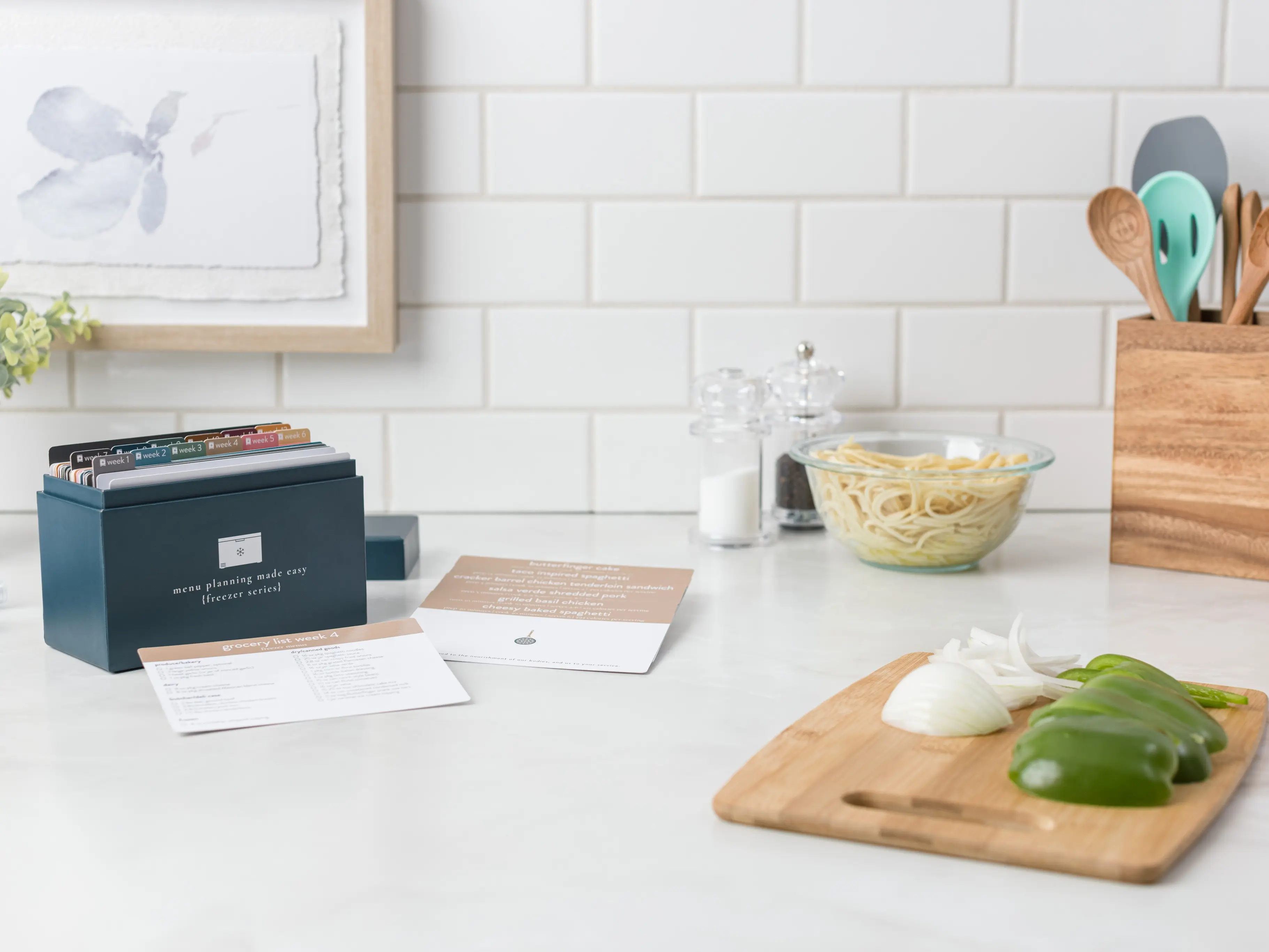 ·Freezer Menu Box: 72 Recipes included, with dry-erase, customizable grocery lists for each week.