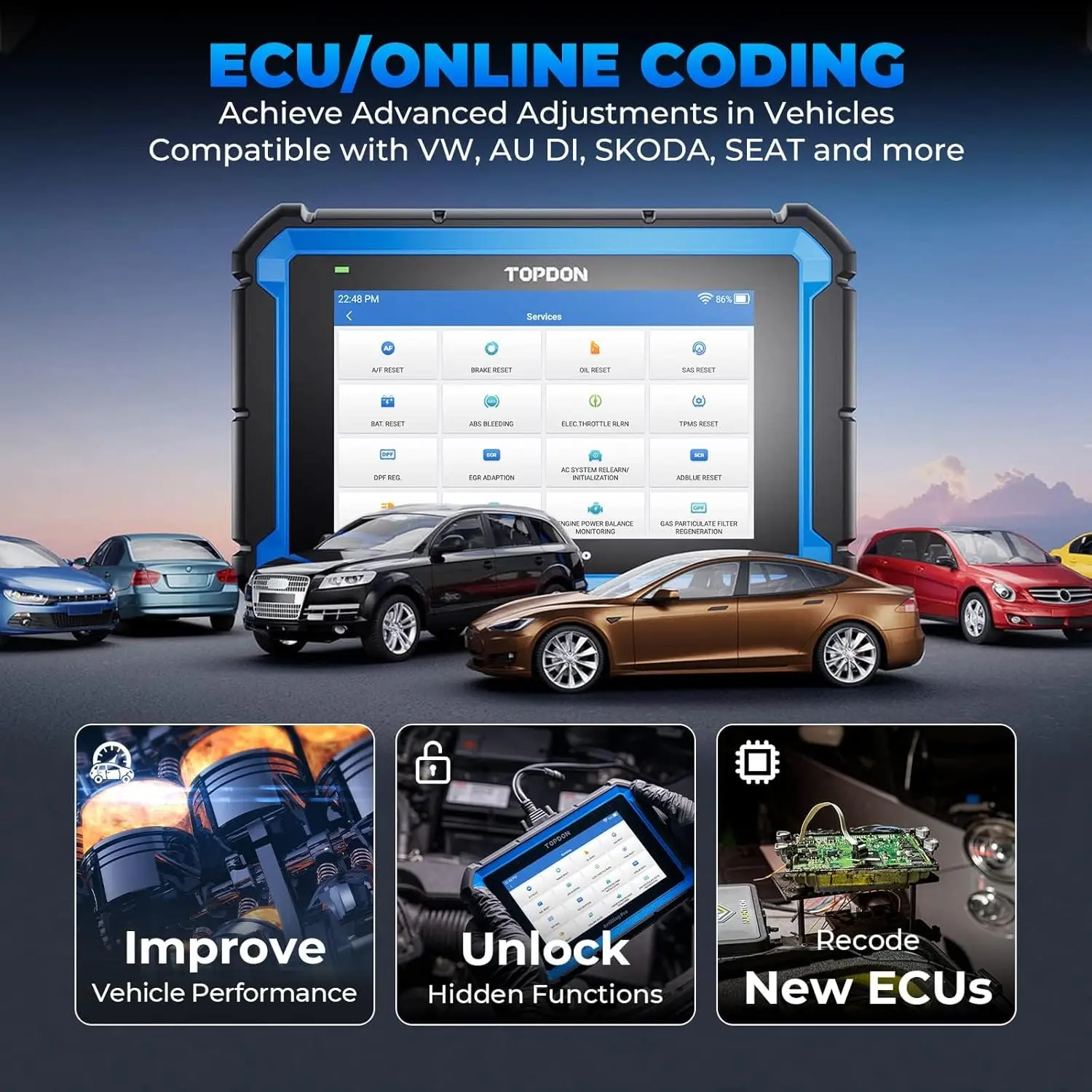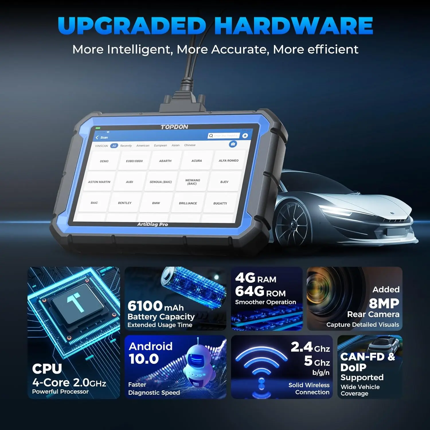 ·The TOPDON ArtiDiag Pro also supports full OBD2 functionalities and performs all modes of OBDII testing on most car makes: Reads Codes Clears Codes Reads Live Data Reads Freeze Frame Data Reads I/M Readiness On-board Monitor Testing Read Vehicle Information Control Operation of On-Board Components/Systems