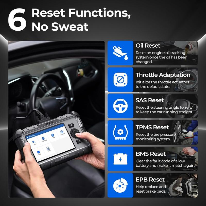 ·The AD500 car diagnostic tool offers essential features like Oil Reset, Throttle Adaptation, SAS/TPMS/BMS/EPB Reset. Easily reset oil change indicators, fine-tune throttle response, and recalibrate steering angle sensors for optimal vehicle performance and maintenance convenience.