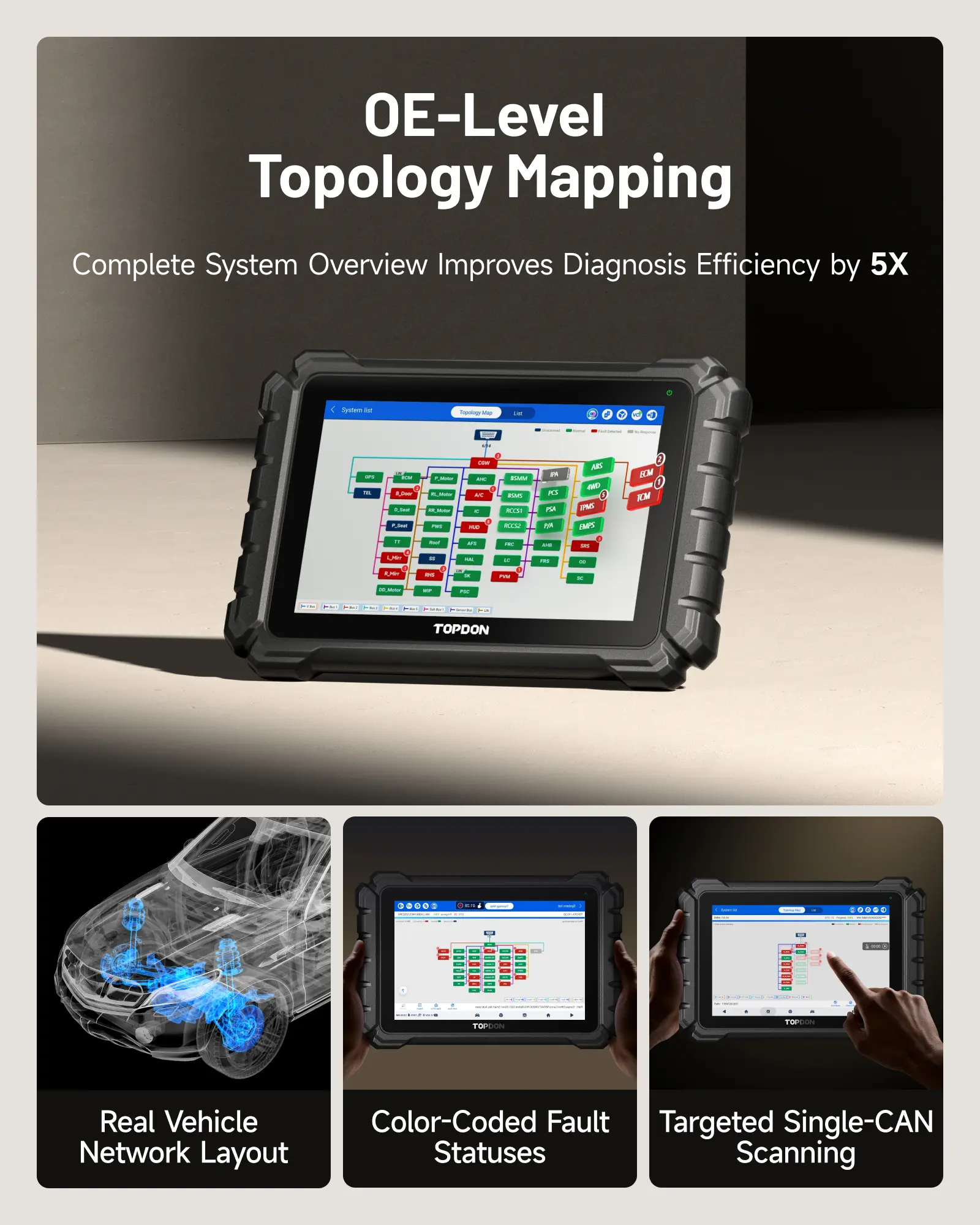 ·Visualize the vehicle’s ECU network exactly as it’s built. TOPDON ONE’s topology mapping displays real-time communication between modules, making it easy to identify faults and isolate problem ECUs. Zoom, pan, and highlight specific modules to pinpoint issues with precision.