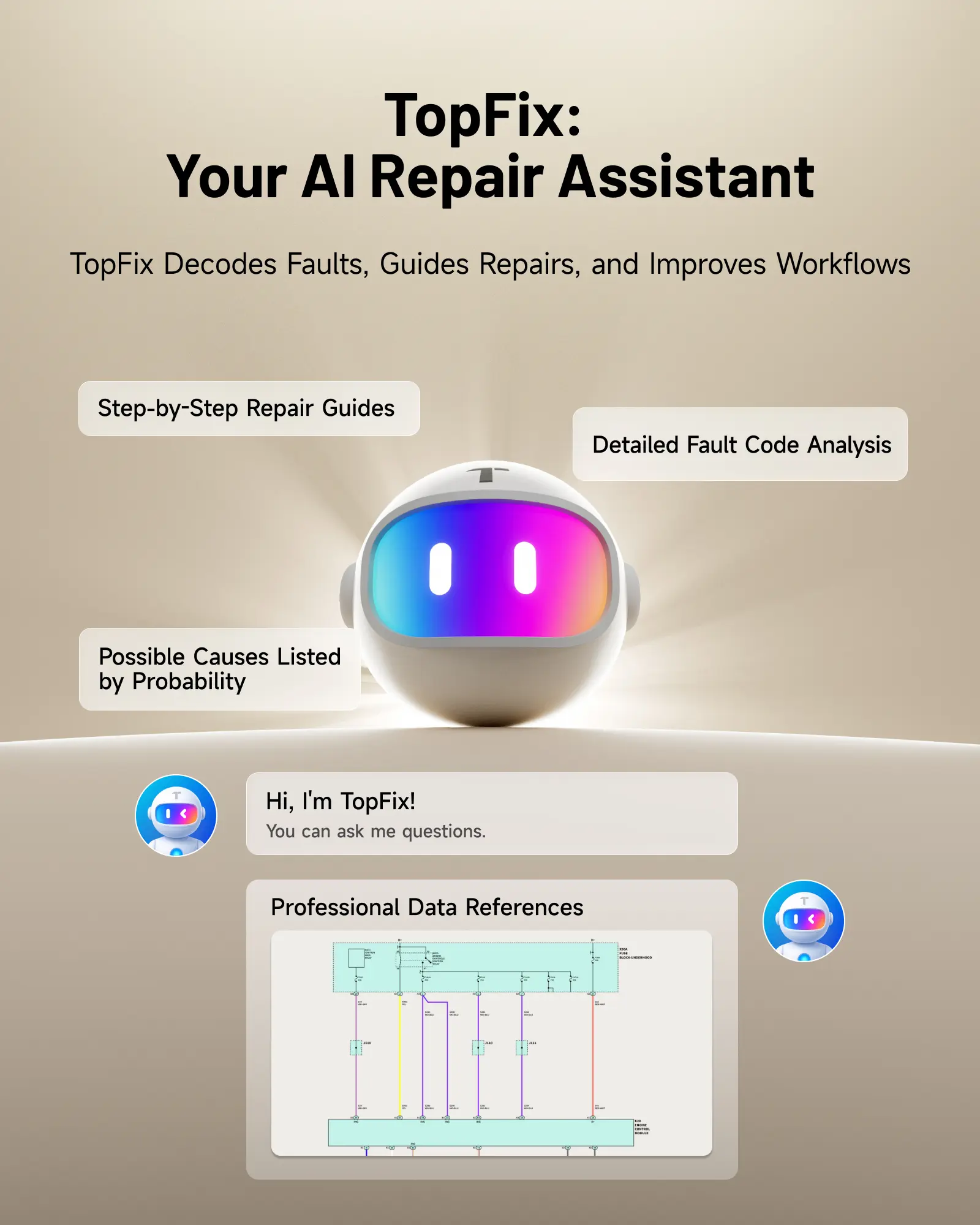 ·TopFix AI gives technicians access to a massive database covering 100+ vehicle brands and over 5 million fault codes. It provides fault descriptions, possible causes, symptoms, and step-by-step repair guidance. Integrated component diagrams and professional wiring schematics help reduce guesswork, shorten diagnostic time, and improve first-time fix accuracy.