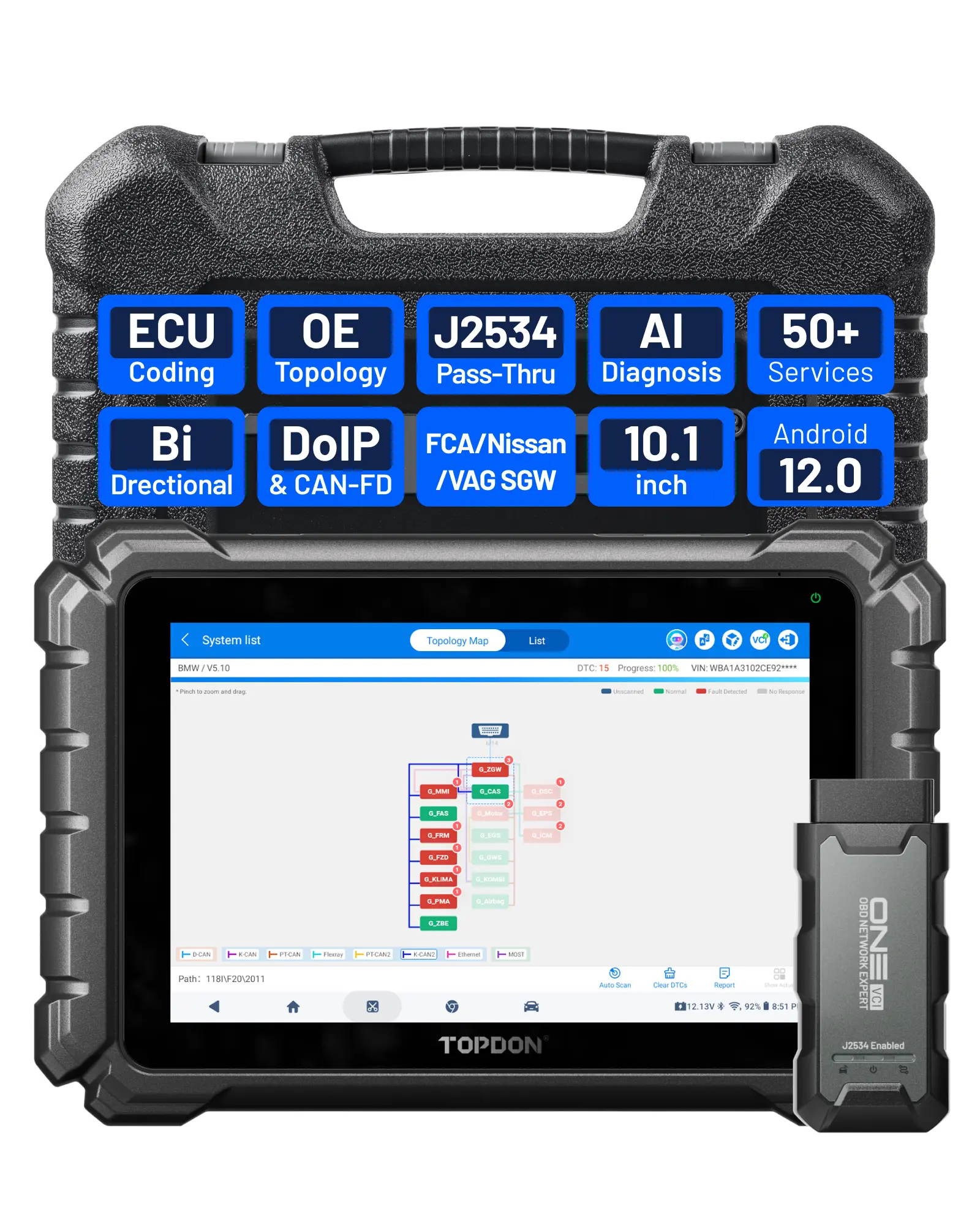 ·TOPDON ONE is a full-featured bidirectional OBD2 scanner built for modern workshops. It delivers full system diagnostics, 50+ service functions, ECU coding for BMW, Mercedes-Benz, and VW, guided VAG diagnostics, gateway access for FCA AutoAuth, Nissan AutoAuth, and VAG SFD, and support for advanced protocols including CAN-FD, DoIP, and J2534—helping technicians diagnose faster, work smarter, and expand service capability.