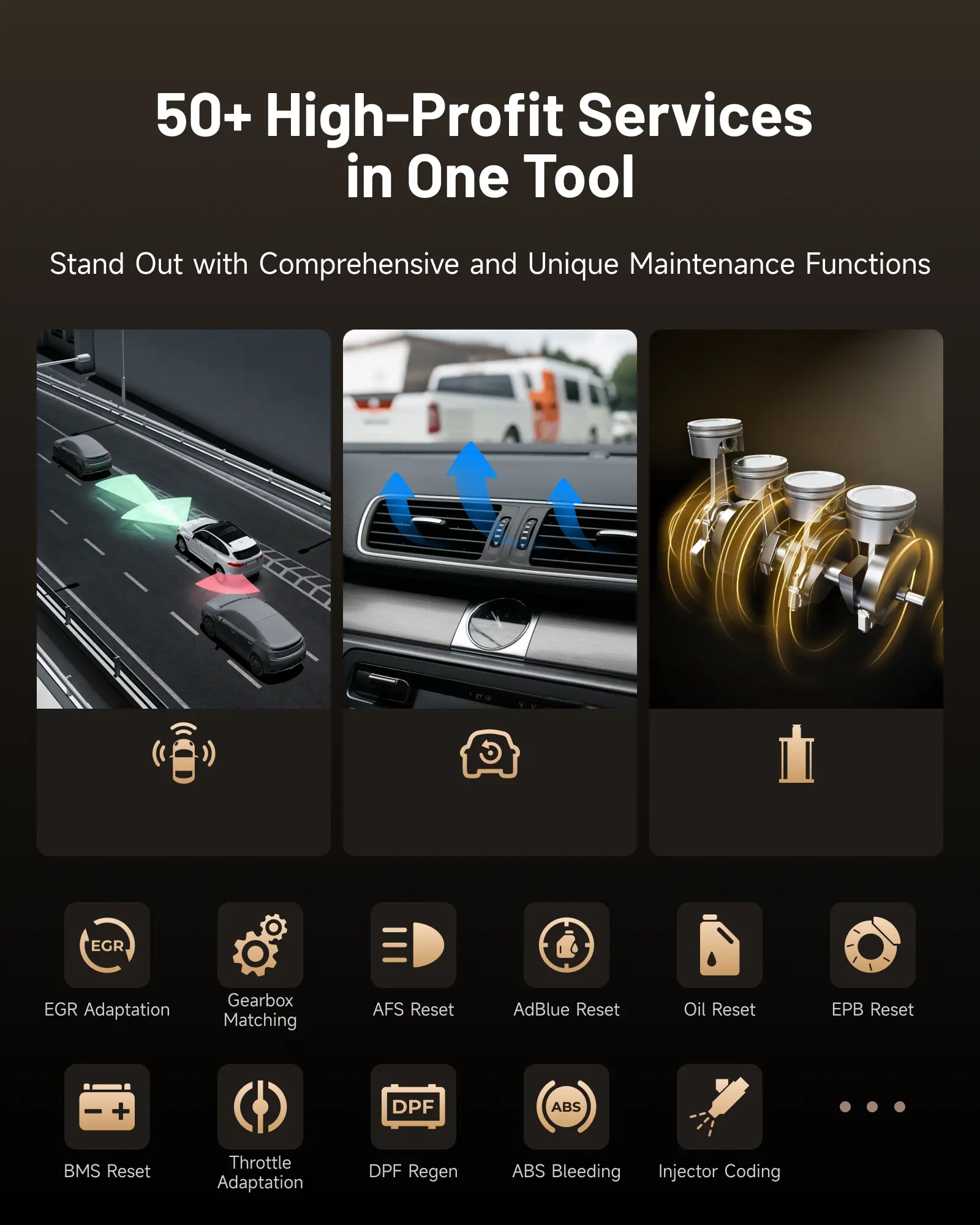 ·TOPDON ONE supports over 50 maintenance and reset services, including oil reset, EPB, BMS, TPMS, ABS bleeding, steering angle calibration, A/C service, VIN coding, camshaft and throttle adaptations, speed and PTO settings, and relative compression testing—covering everything from routine maintenance to advanced diagnostics.