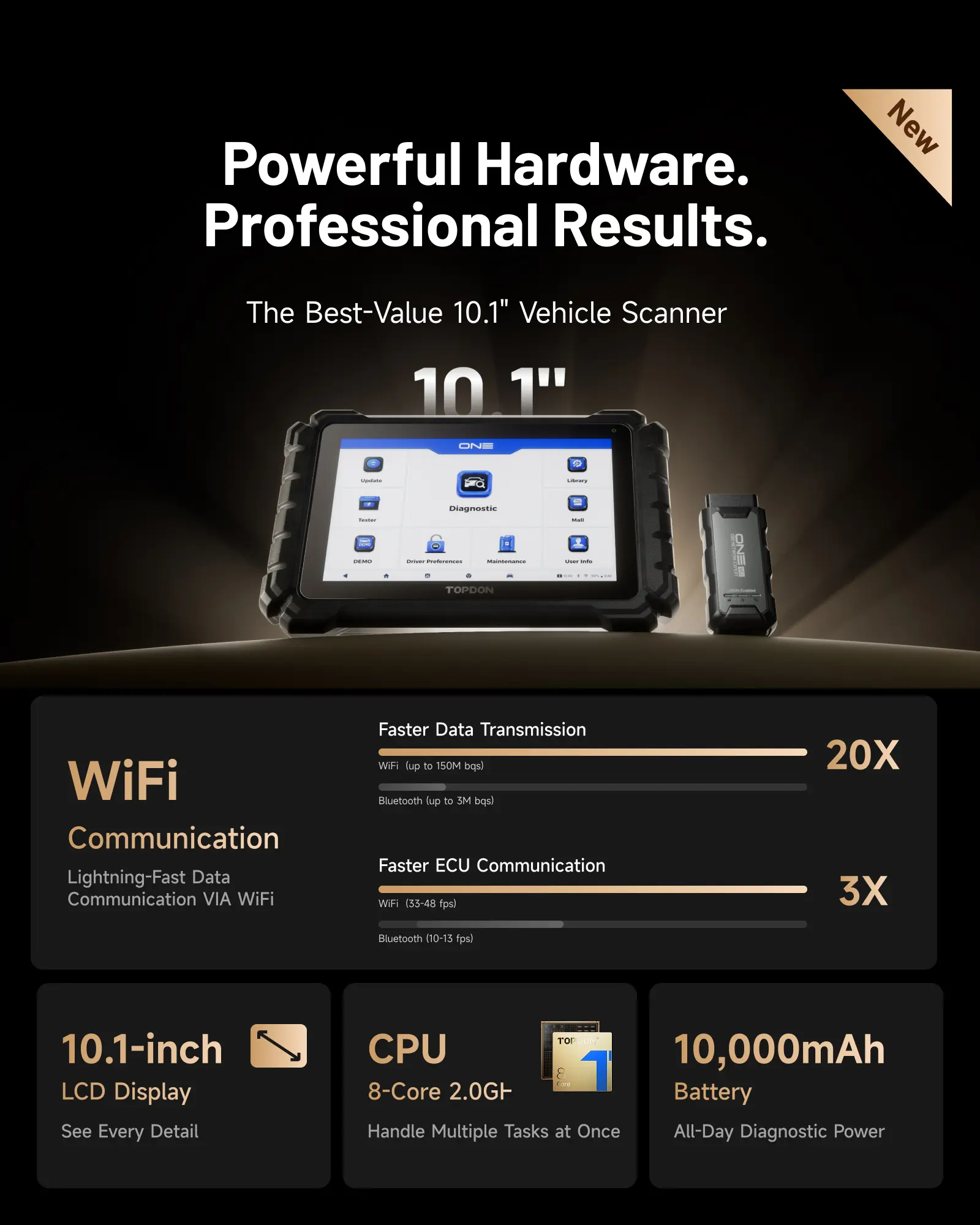 ·Powered by an octa-core processor and a large 10.1-inch touchscreen, TOPDON ONE handles complex diagnostics without lag. With 4GB RAM, 128GB storage, and a 10,000 mAh battery, it’s designed for all-day operation. Wi-Fi communication between the tablet and ONE VCI delivers data transfer up to 20× faster and ECU communication up to 3× quicker than traditional Bluetooth connections.