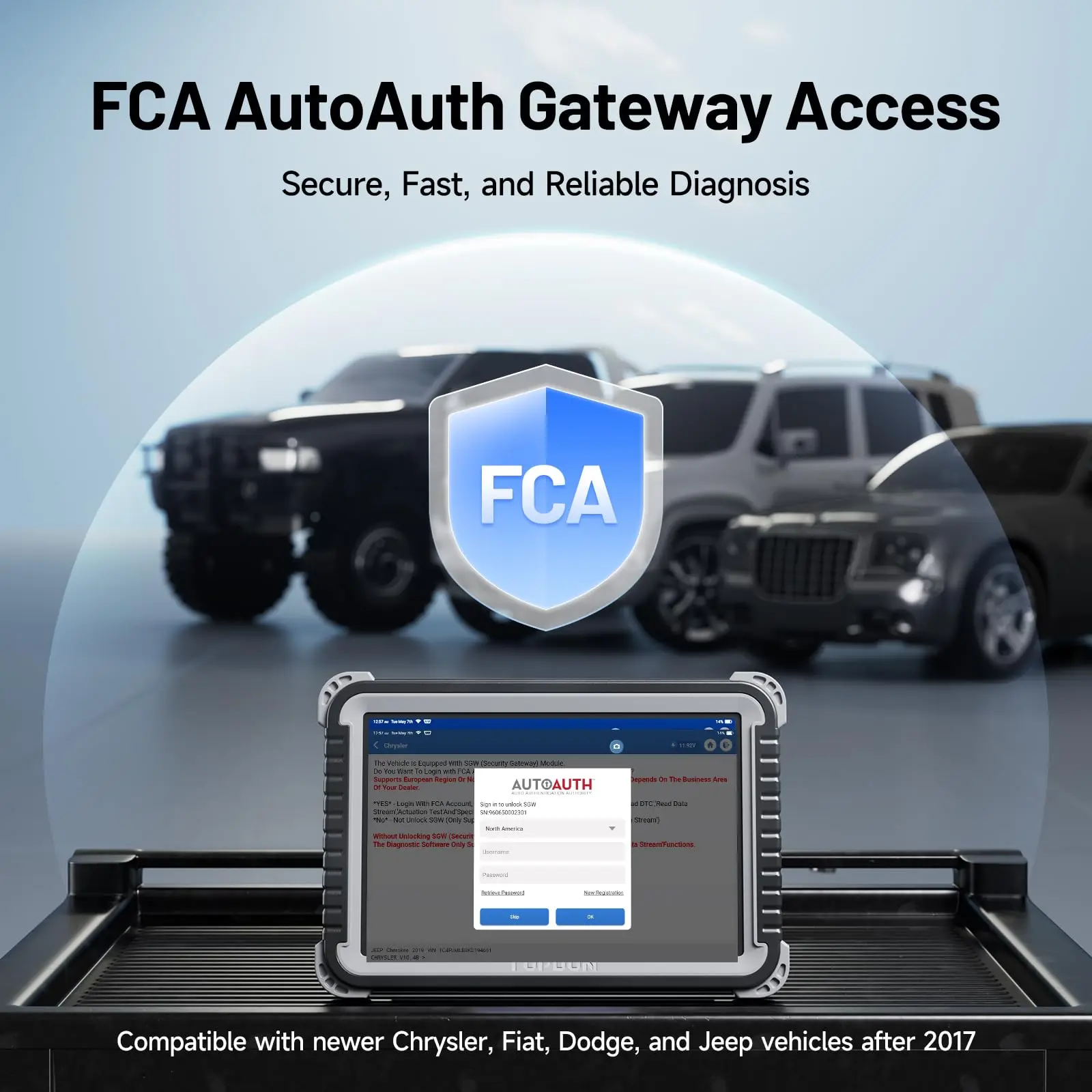 Reads codes, clears faults, retrieves ECU info, live data, and active tests across all systems—ECM, ABS, TCM, BCM, A/C, fuel, lighting, etc.