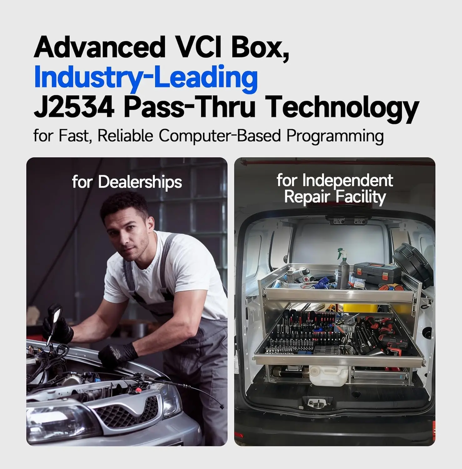 ·Advanced VCI Box, Industry-leading J2534 Pass-Thru Technology: This J2534 Pass-Thru Programmer is designed espically for technicians, independent shop owners, and DIY enthusiasts, enables fast, reliable computer-based programming. It supports all J2534 protocols—including the latest DoIP and CAN FD—ensuring full compatibility with both legacy and next-generation vehicles.