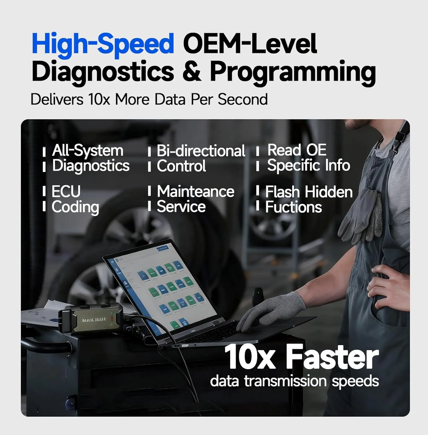 ·High-Speed OEM-Level Diagnostics & Programming: Unlock true OEM functionality with comprehensive system diagnostics, guided troubleshooting, coding, adaptations, resets, and programming—all designed to slash repair time. This all-in-one tool eliminates the need for multiple OEM devices, boosting efficiency and cutting costs. Equipped with High-Speed USB, it delivers 10x more data per second than competing solutions