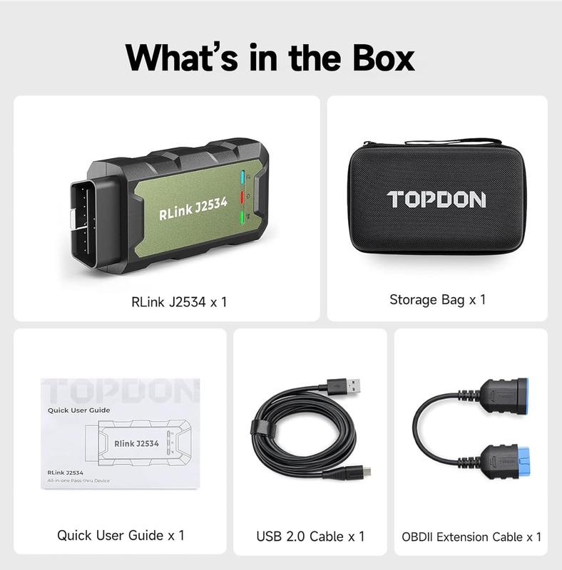 ·What You Will Get: 1 x TOPDON RLink J2534; 1 x 1.2 ft OBDII Extension Cable; 1 x 6.6 ft USB 2.0 Cable; 1 x Quick User Guide; 1 x Storage Case; 1 Year Warranty; U.S.-based support service