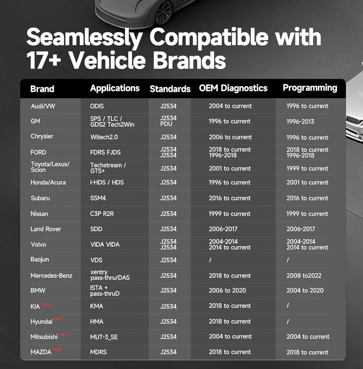 ·Coverage for 17 Car Brands & Ultra Reliability: Works seamlessly for Chrysler, for Ford(Forscan), for GM, for Nissan, for Toyota, for Honda, for Subaru(SSM4), for Land Rover/Jaguar, for Volvo, for Wuling, for Volkswagen, for Mercedes-Benz, and for BMW. Backed by over 10000 real vehicle tests and benefit from a wealth of practical experience, this OEM reprogramming tool guarantees stable and exceptional performance