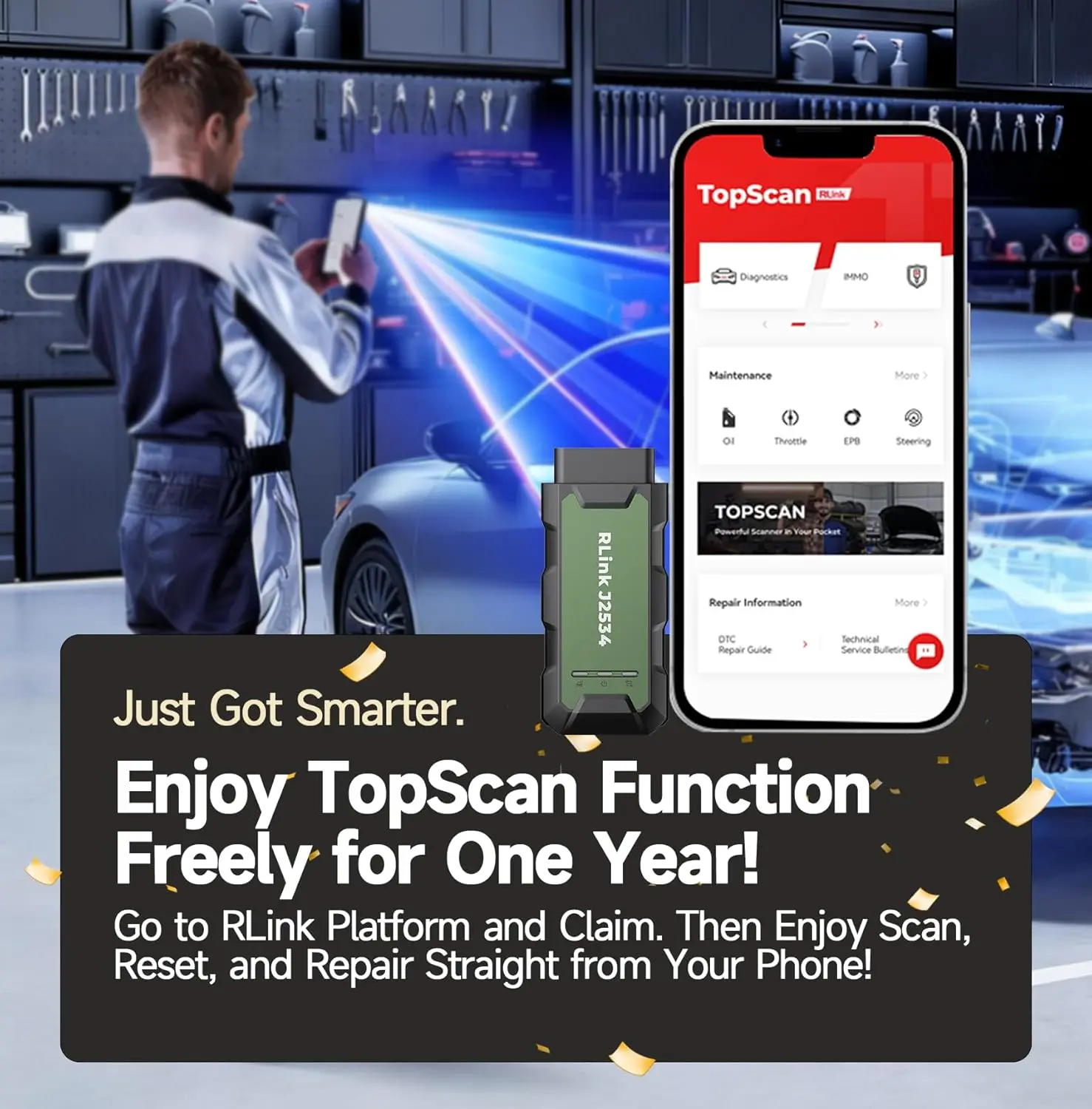 ·Unlock TopScan Function, Mobile Diagnostic Anywhere: Now you can unlock more potential with *TopScan for ONE Year. Scan, reset and repair straight from your phone on over 120+ car brands and covers 10,000+ vehicle models, including read/clear codes, ECU information, AUTO VIN, viewing real-time data, and active tests. Just go for RLink Platform and Claim Now!