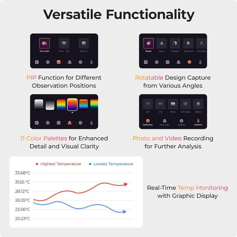 The TOPDON TC002C thermal camera offers a 256x192 resolution for clear, detailed thermal images. It features a 25Hz refresh rate and high heat sensitivity of 40mK. The rotatable design ensures precise visuals from every angle. Perfect for measuring temperatures from -4°F to 1022°F with ±2℃ or 2% error.