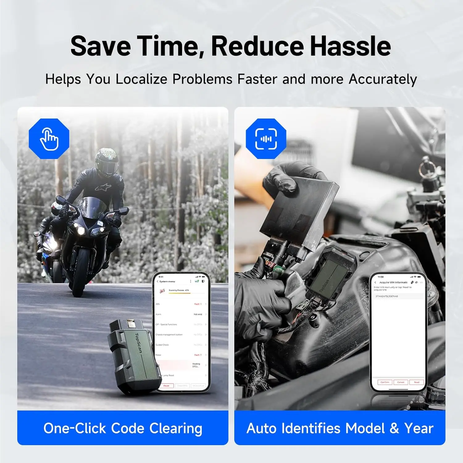 ·8+ Popular Functions, Full System Diagnosis: Topscan supports OBD2 full system diagnosis functions, including reading/clearing codes, reading ECU information,AUTO VIN, viewing real-time data, and conducting active tests. It offers 8+ reset functions including Oil Reset, Throttle Adaptation, EPB Reset, Steering Angle Reset, DPF Regeneration, ABS Bleeding, BMS Reset, and Airbag Reset. By these functions, you can save on unnecessary repair costs and reduce repair times significantly.