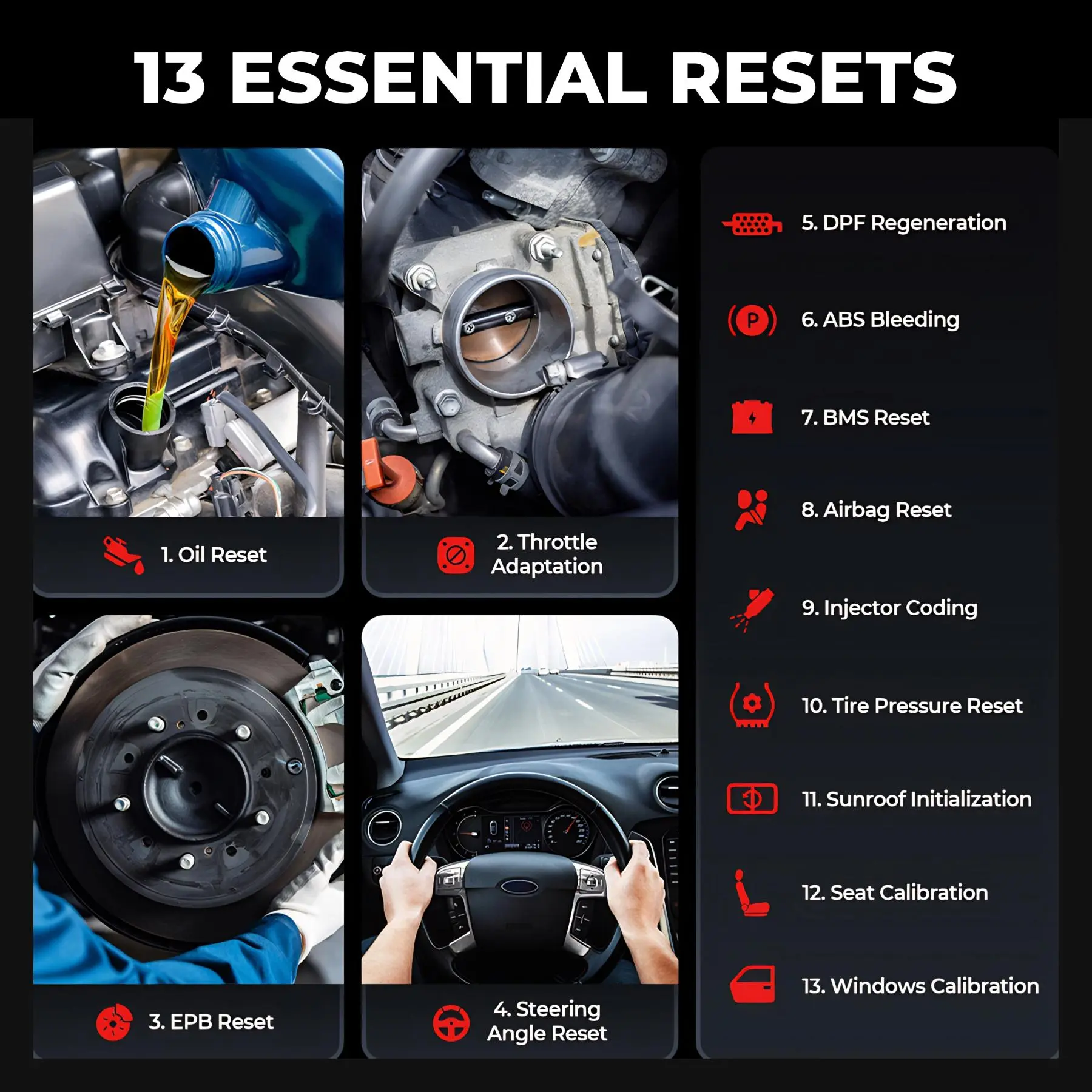 TopScan PRO offers the extended 13 most commonly used reset functions for your vehicle: Oil Reset/Throttle Adaptation/EPB Reset/Steering Angle Reset/ABS Bleeding/DPF Regeneration/BMS Reset/Airbag Reset/Injector Coding/TPMS Reset/Sunroof Initialization/Seats Calibration/Window Calibration/