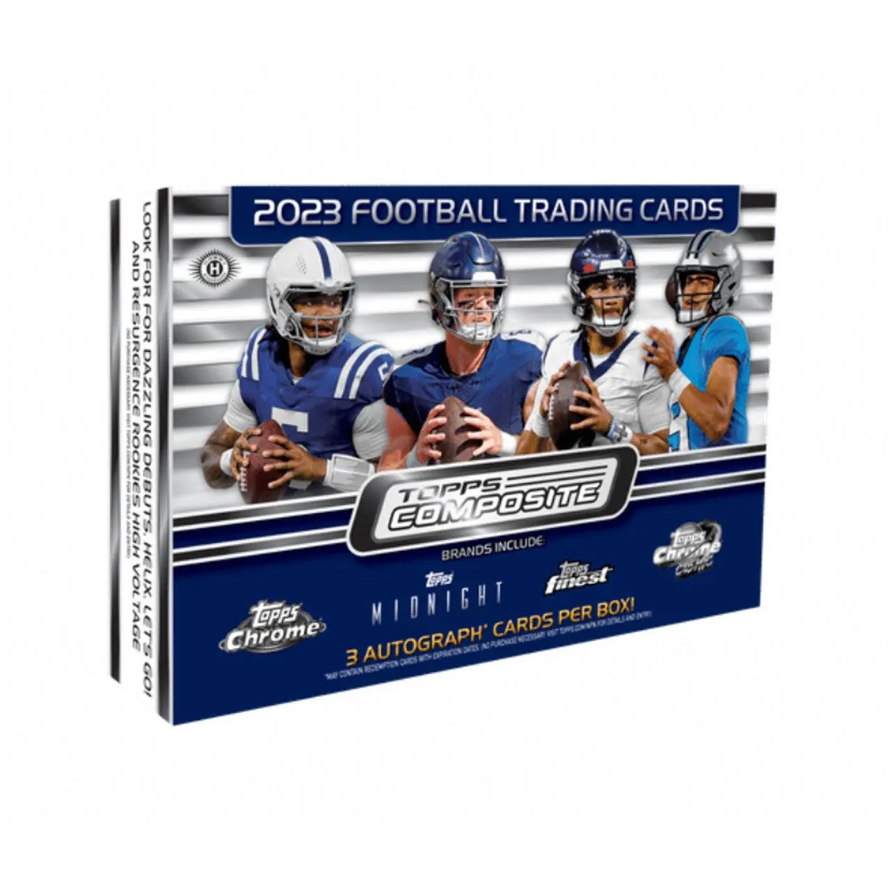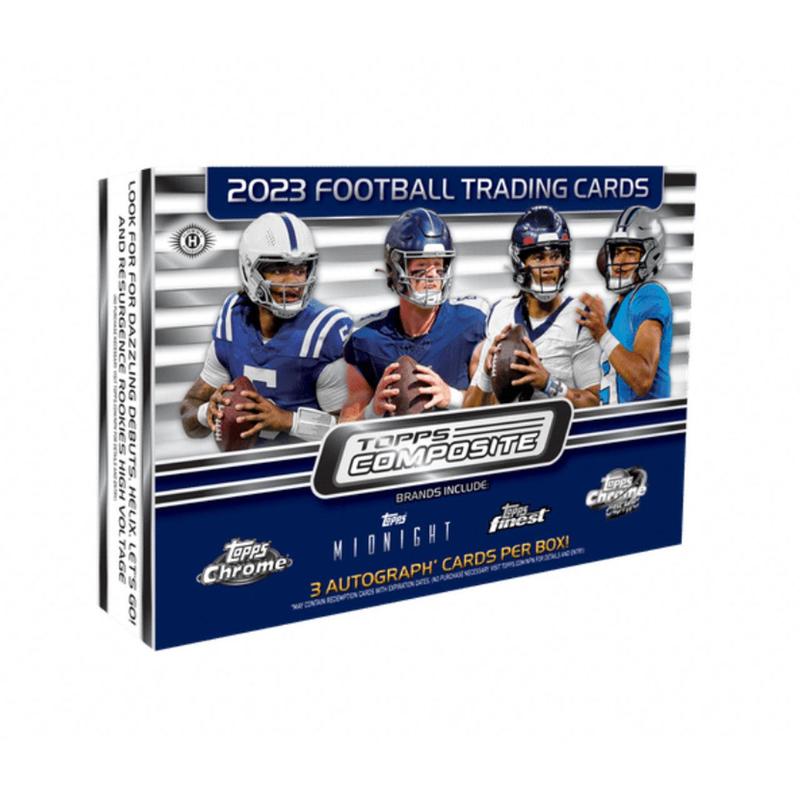 Each Box contains Three Autographs, One Base Card Refractor, One Exclusive Base Card Geometric Parallel, and Five additional Parallels!Each CASE contains One Resurgence High Voltage!2023 Topps Composite Football is debuting with a lineup of electric products, inserts and beautiful parallels!Find cards from some of the most popular brands in the Topps catalogue.Look for Topps Chrome, Chrome Black, Resurgence, Finest, Cosmic Chrome, Midnight, Allen & Ginter, Archives, Heritage, and more!10 Boxes Per Case, 1 Pack Per Box, 10 Cards Per Pack