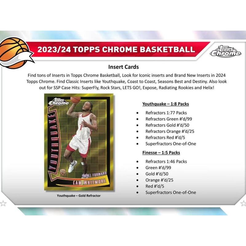 ·Exclusive Inserts and Parallels: Discover a range of classic and brand-new inserts, including Youthquake, Finesse, Destiny, Coast to Coast, and Seasons Best, spotlighting emerging talents and basketball stars. Also look for rare SSP Case Hits and new inserts like Superfly, Rock Stars, LETS GO!, Expose, Radiating Rookies, and Helix.