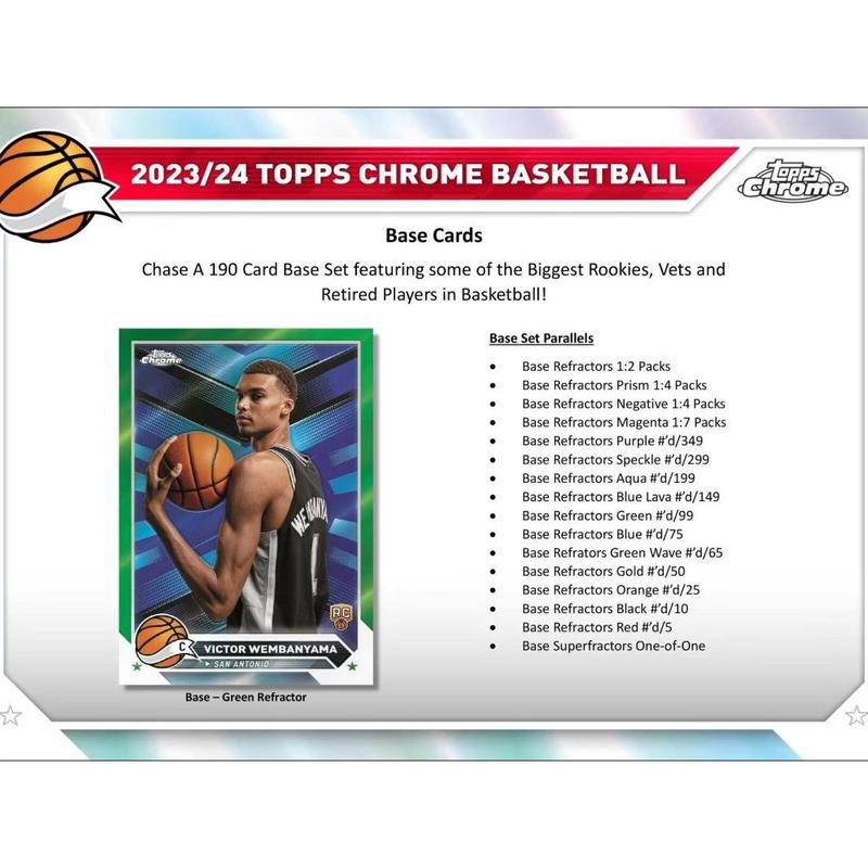 Returning to the Hobby in 2024, Topps Chrome Basketball is back with a bang! Dive into the excitement of the new season with this highly anticipated release that includes a dazzling lineup of Victor Wembanyama autographs, sought-after rookie cards, and a plethora of stunning inserts.
