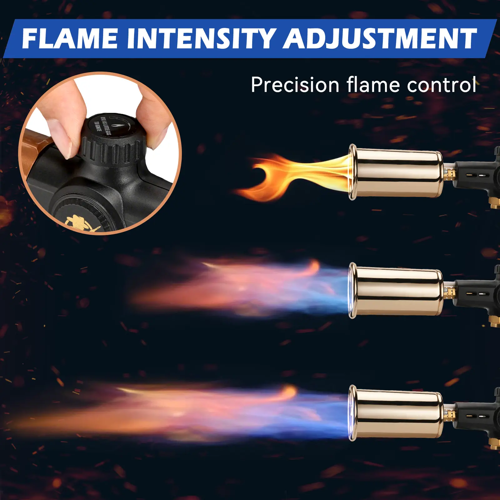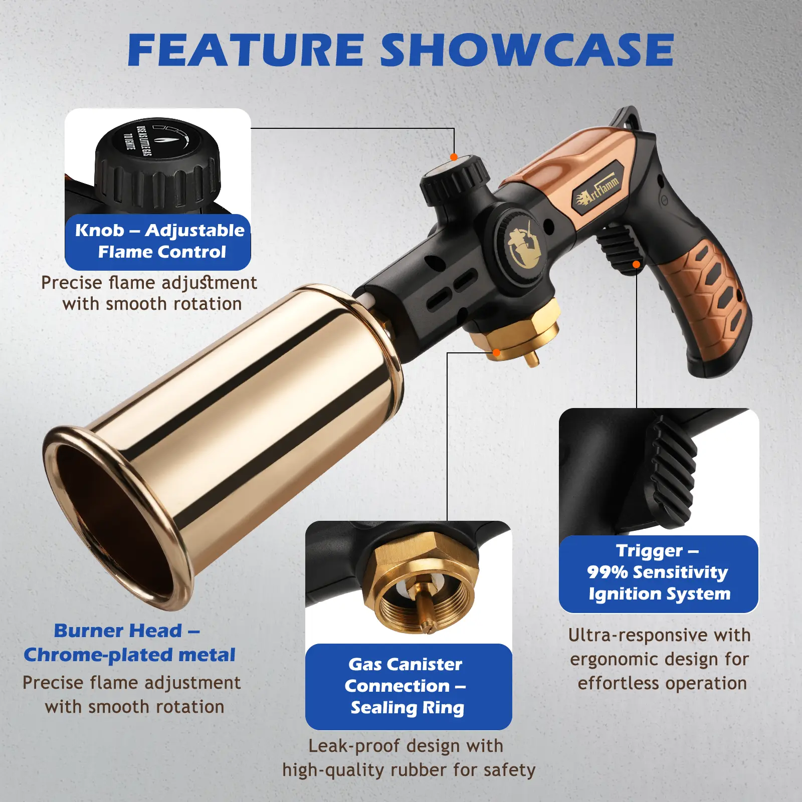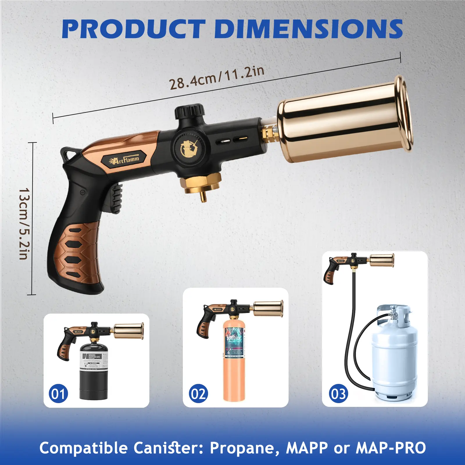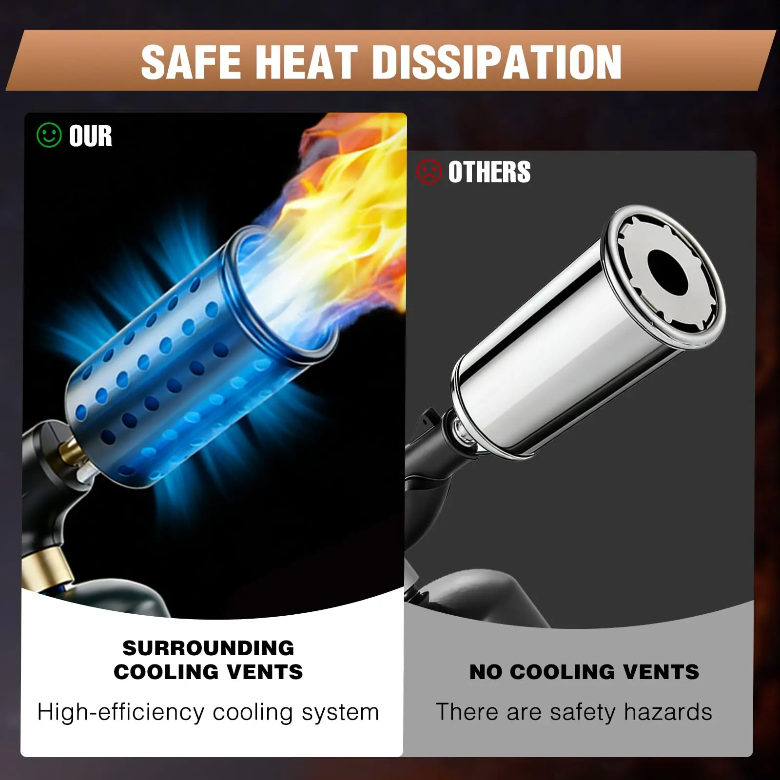 【Professional-Grade Build】Engineered for durability and performance. Features a solid brass burner head that withstands high temperatures and resists corrosion, coupled with a reinforced fuel hose for guaranteed safety. Refillable with standard propane tanks (not included in the kit) for cost-effective, long-term use.