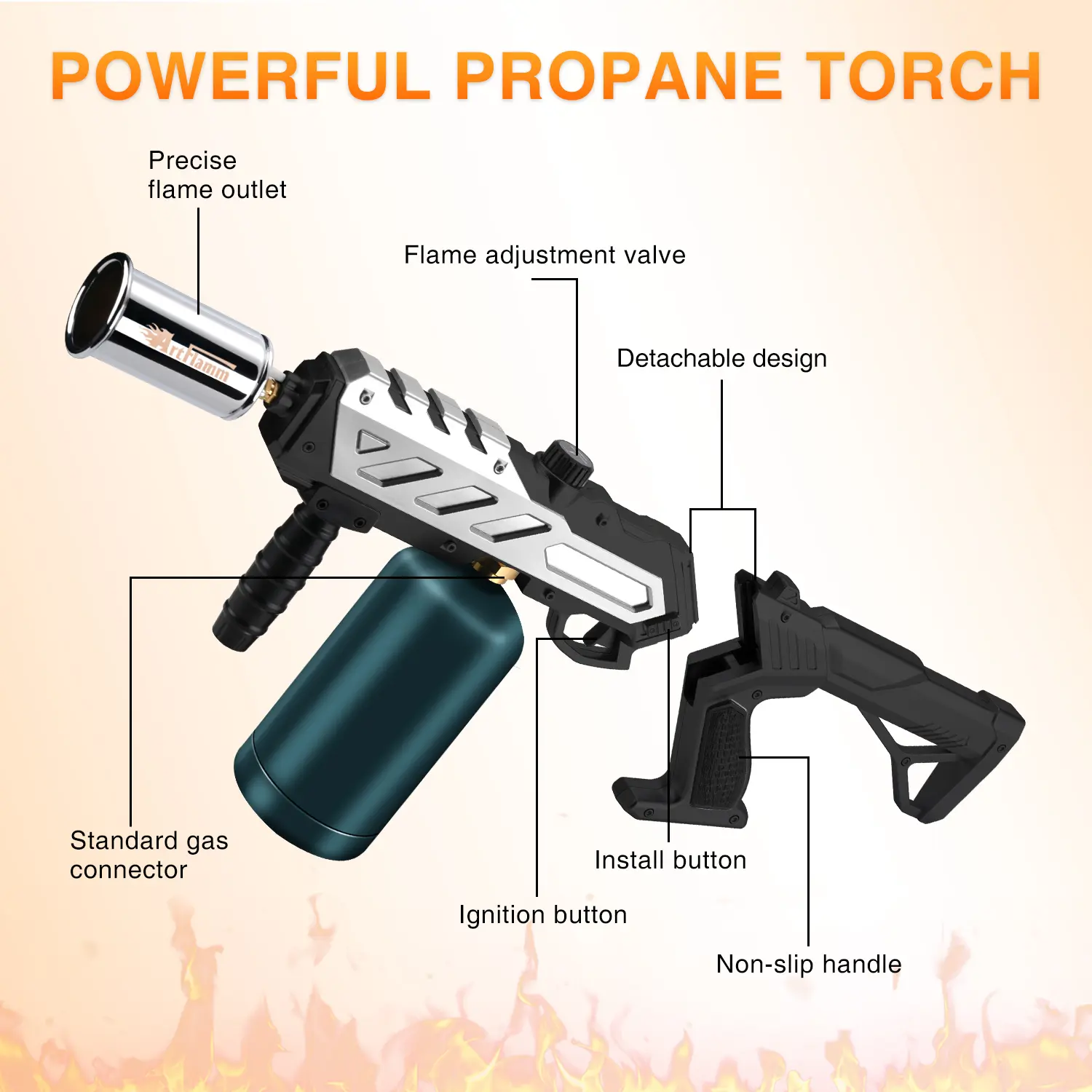 The upgraded flame gun features a detachable design, allowing the handle and torch body to be combined or separated freely. Disassemble for storage, enhancing safety and portability. The ergonomic handle ensures effortless operation.