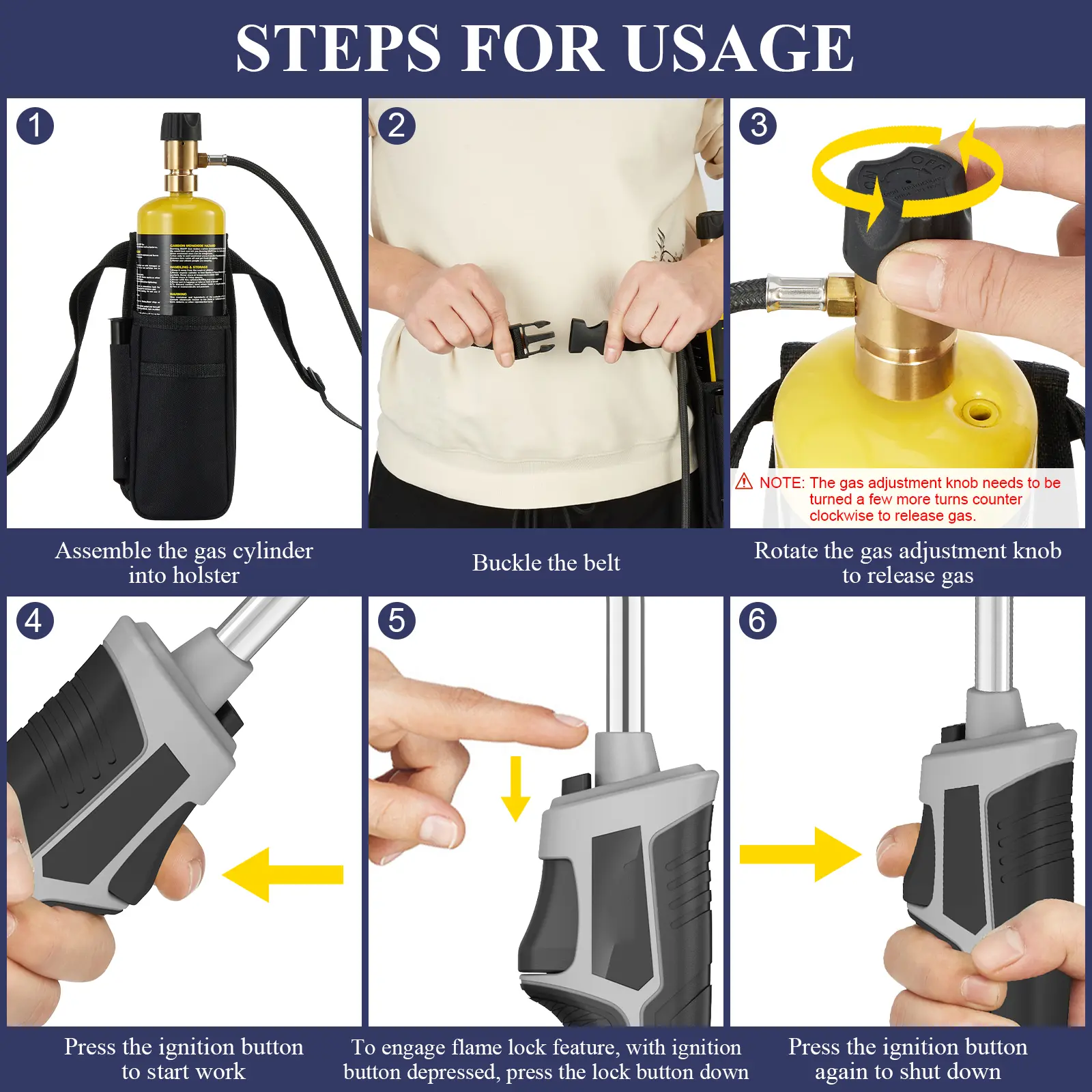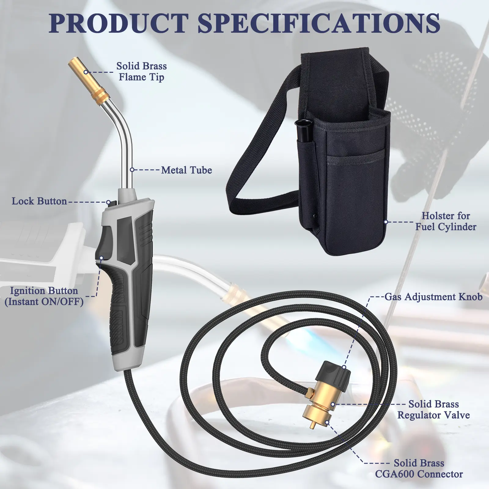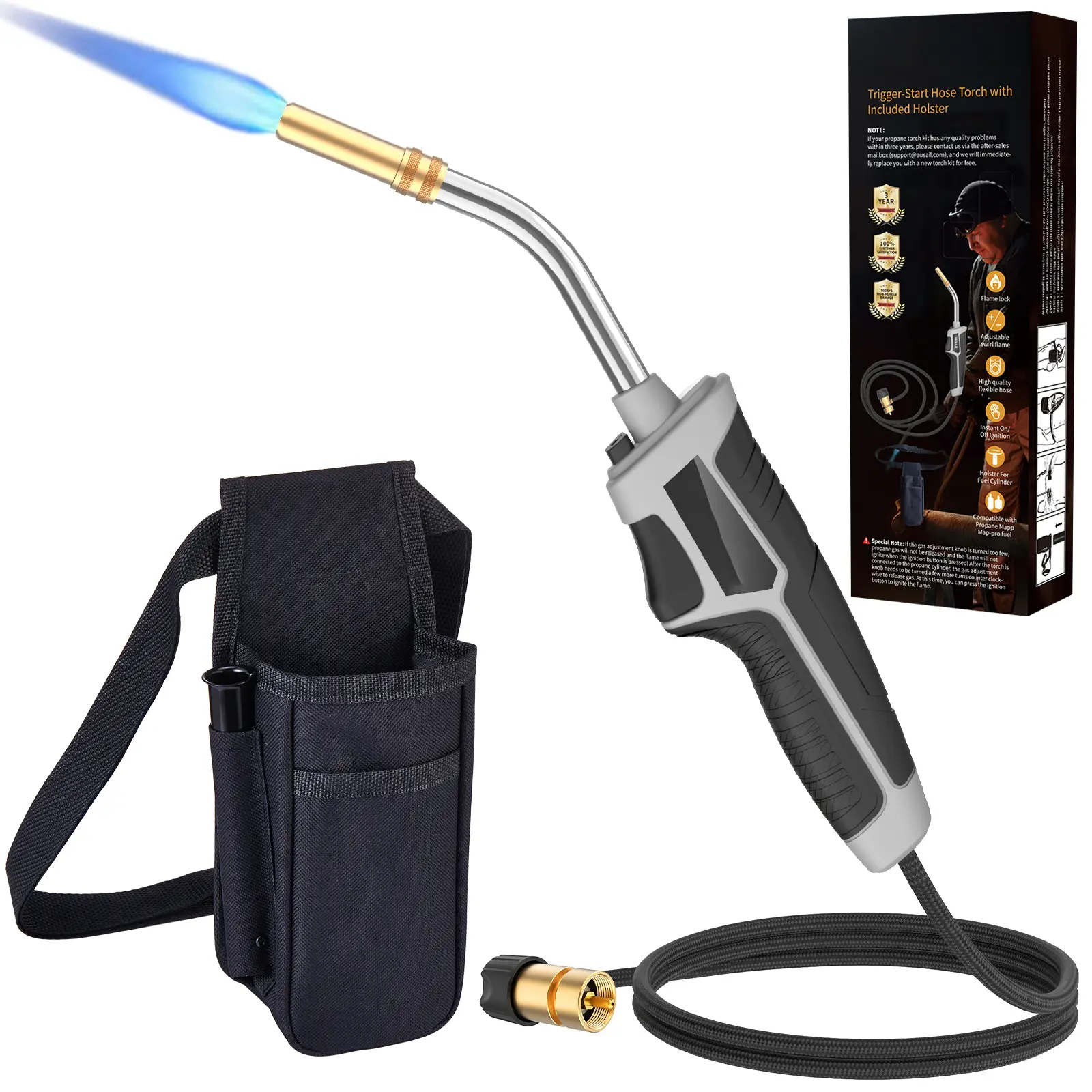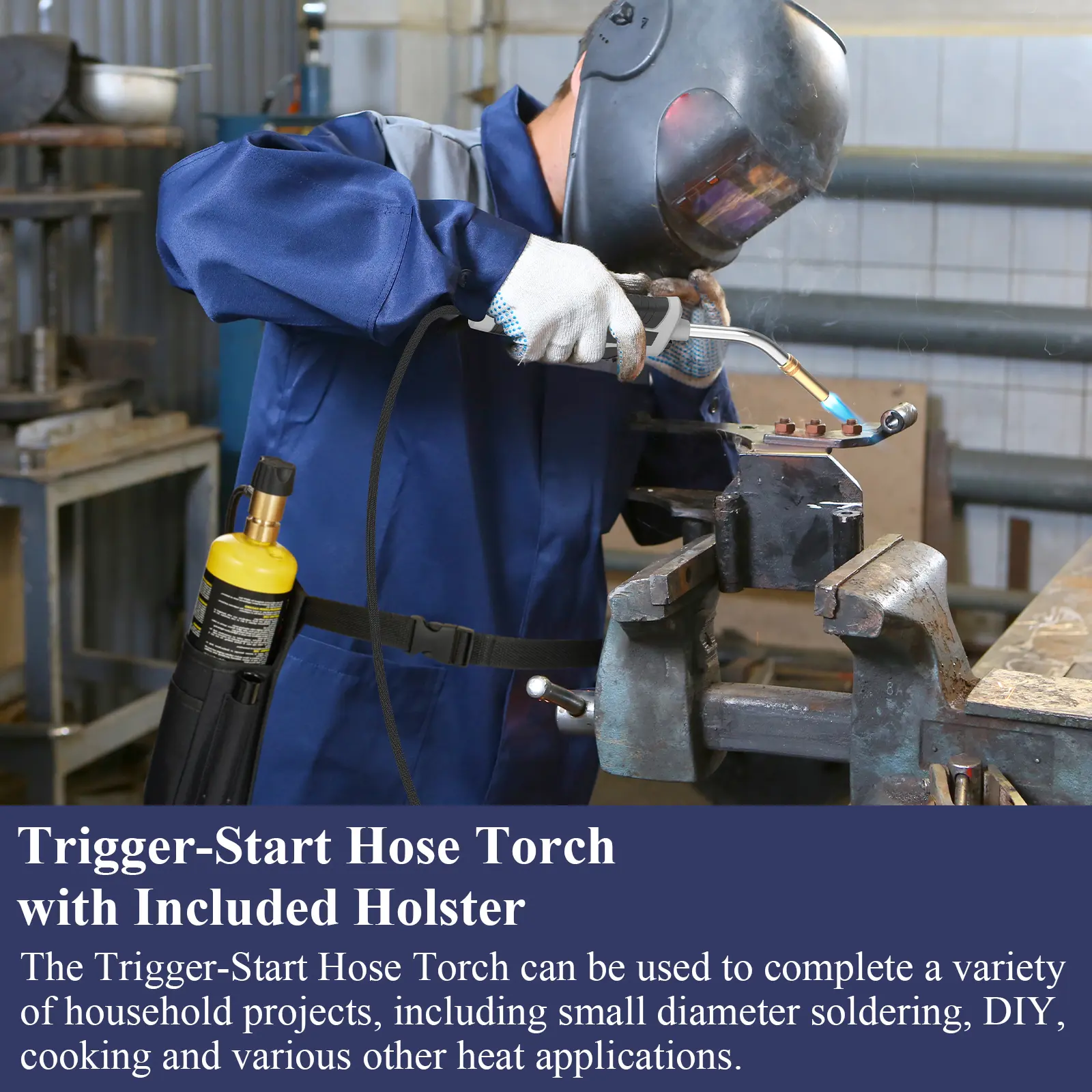 【Perfect Propane Torch Kit】The Mapp gas Torch set includes a 5-foot long hose and holster. The extra-long hose allows for more flexibility in working, and the holster allows it to be worn around the waist for upright cylinder positioning.