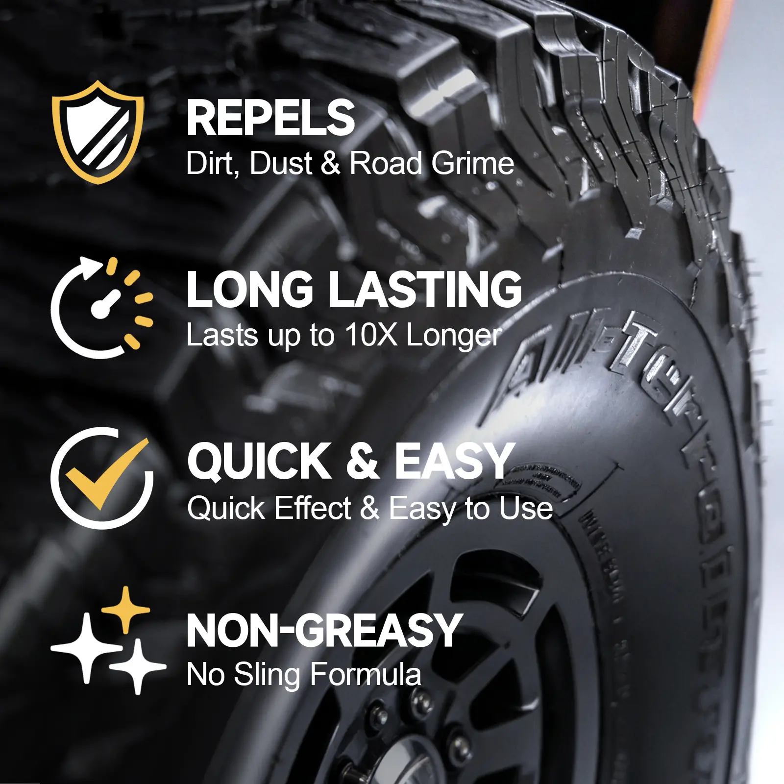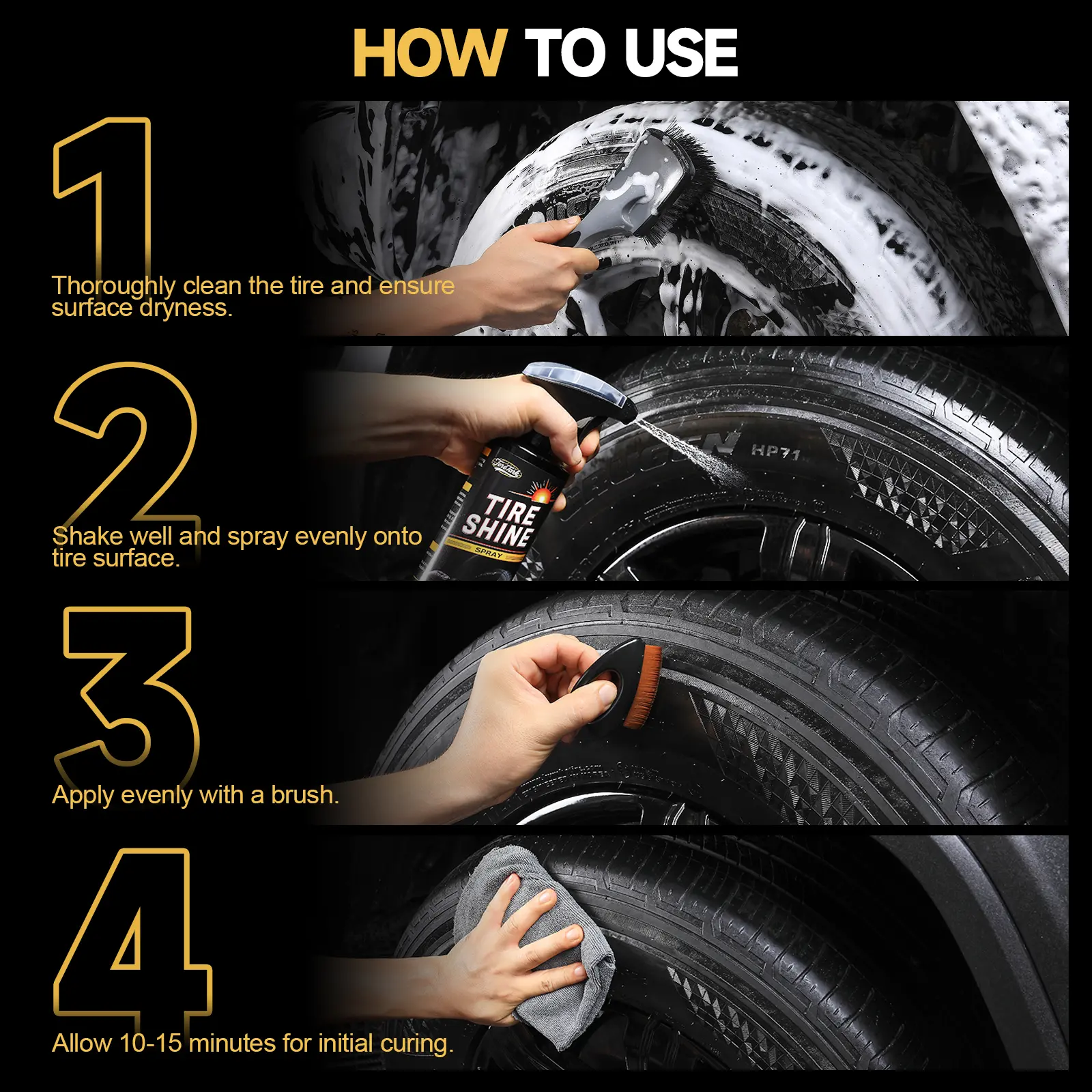 - Its brightening and blackening formula restores tires to a like-new appearance, while the high-penetration formula quickly forms a protective film on the tire surface, resisting dust and dirt adhesion for easier cleaning.