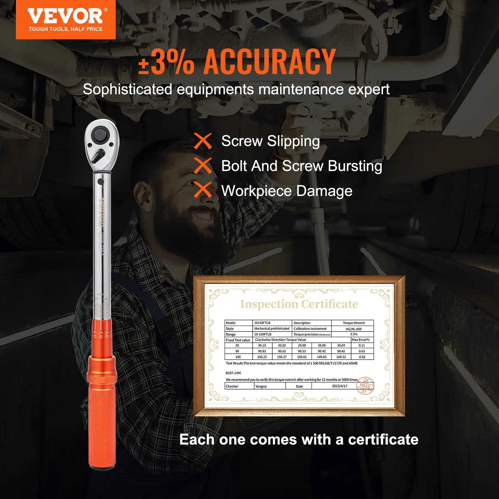 • Accurate Measurements: Our 1/2" mechanical torque wrench boasts a torque range of 110-150 ft.lb / 14-204 n.m, providing exceptional accuracy of up to ±3%. Calibration certificates accompany each torque wrench set, ensuring that you can confidently and precisely tighten fasteners on your vehicle or equipment without incurring any damage.