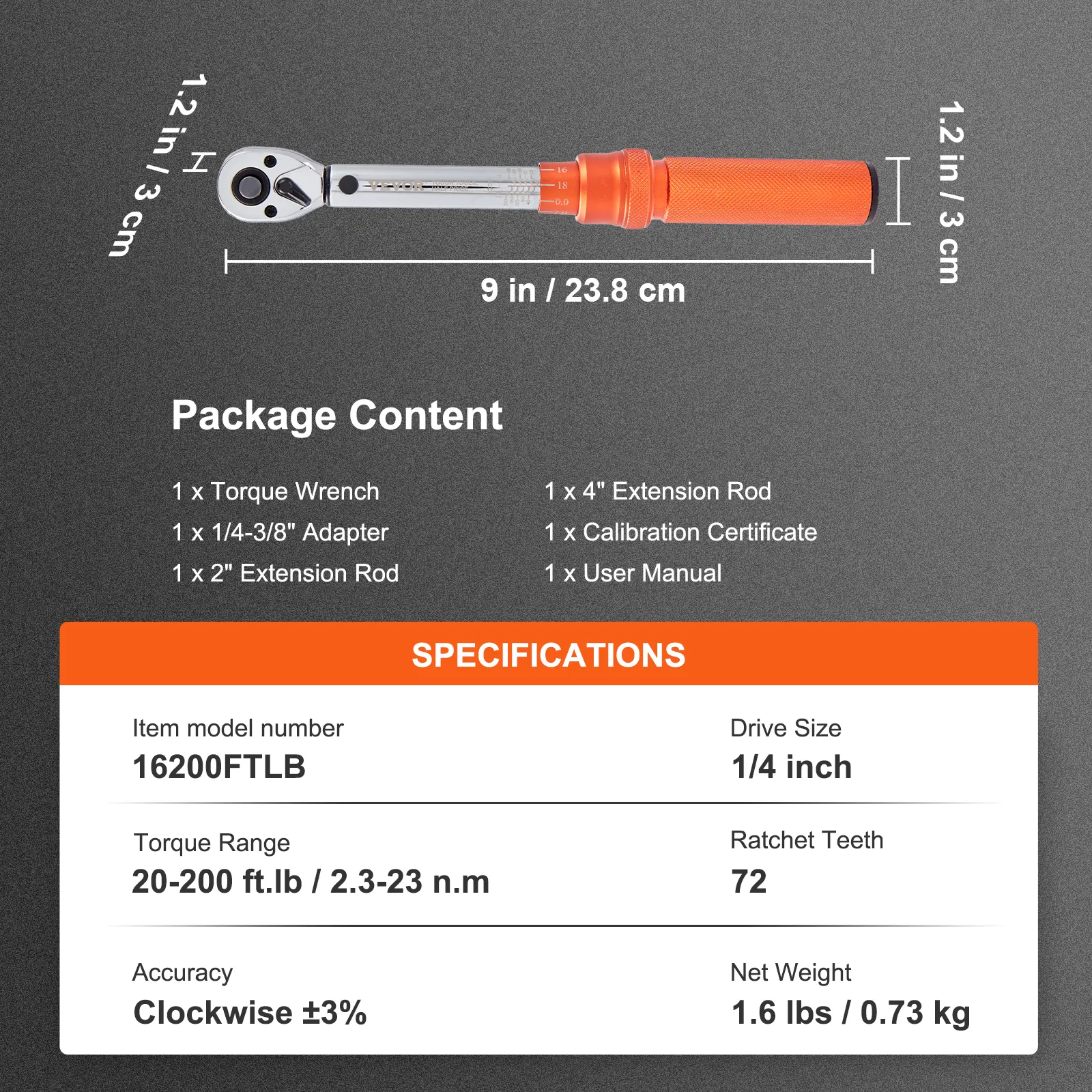 • Accurate Measurements: Our 1/4" mechanical torque wrench boasts a torque range of 20-200 in.lb / 2.3-23 Nm, providing exceptional accuracy of up to ±3%. Calibration certificates accompany each torque wrench set, ensuring that you can confidently and precisely tighten fasteners on your vehicle or equipment without incurring any damage.