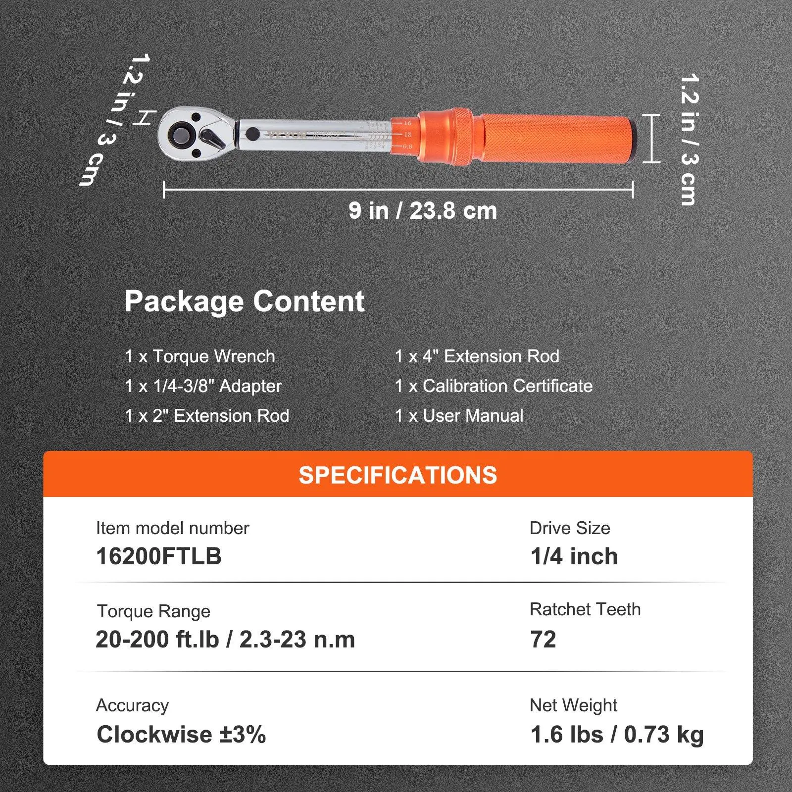 • High Compatibility: The adjustable torque wrench comes equipped with drive adapters and extension bars, making it an incredibly versatile tool that can be used for a wide range of applications. Compatible with both 1/2", 1/4", and 3/8" bolt sizes, this wrench is perfect for use in tight or deep spaces where access is limited.