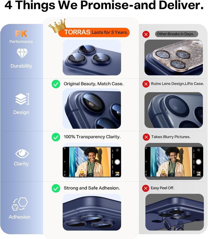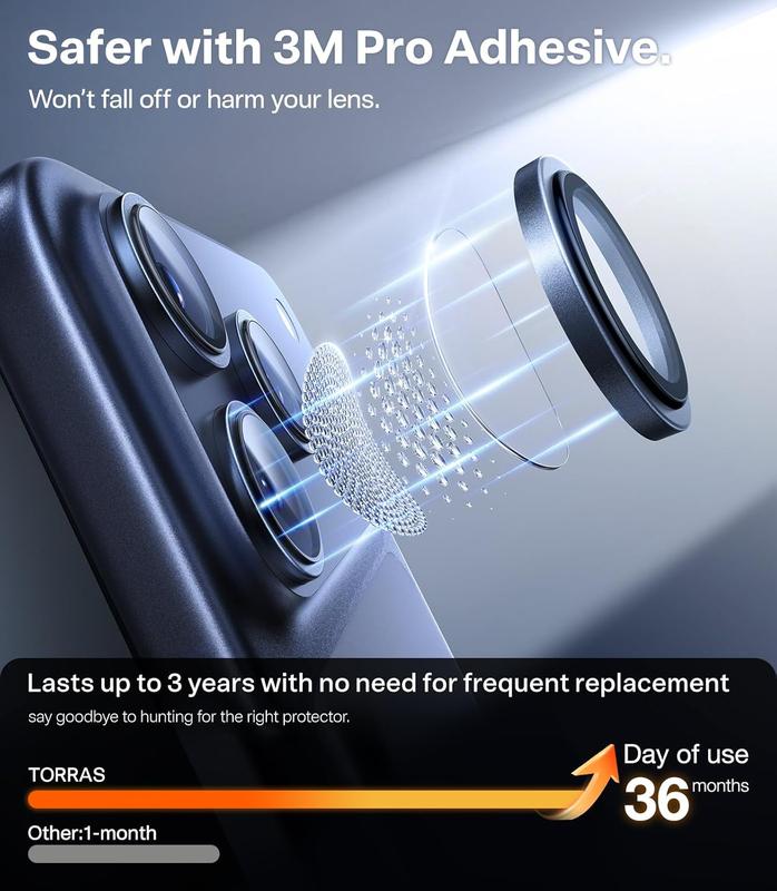 TORRAS 3-Year Ultimate Durability for iPhone 17 Pro Max/17 Pro Camera Lens Protector offers top-notch protection with proven durability. It ensures a clear view, no color shift, and no extra weight. The advanced 3M pro adhesive ensures secure adhesion, and the 1:1 invisible fit makes it barely noticeable. With a 3-year warranty and 24/7 customer support, it's a smart choice for lasting protection.