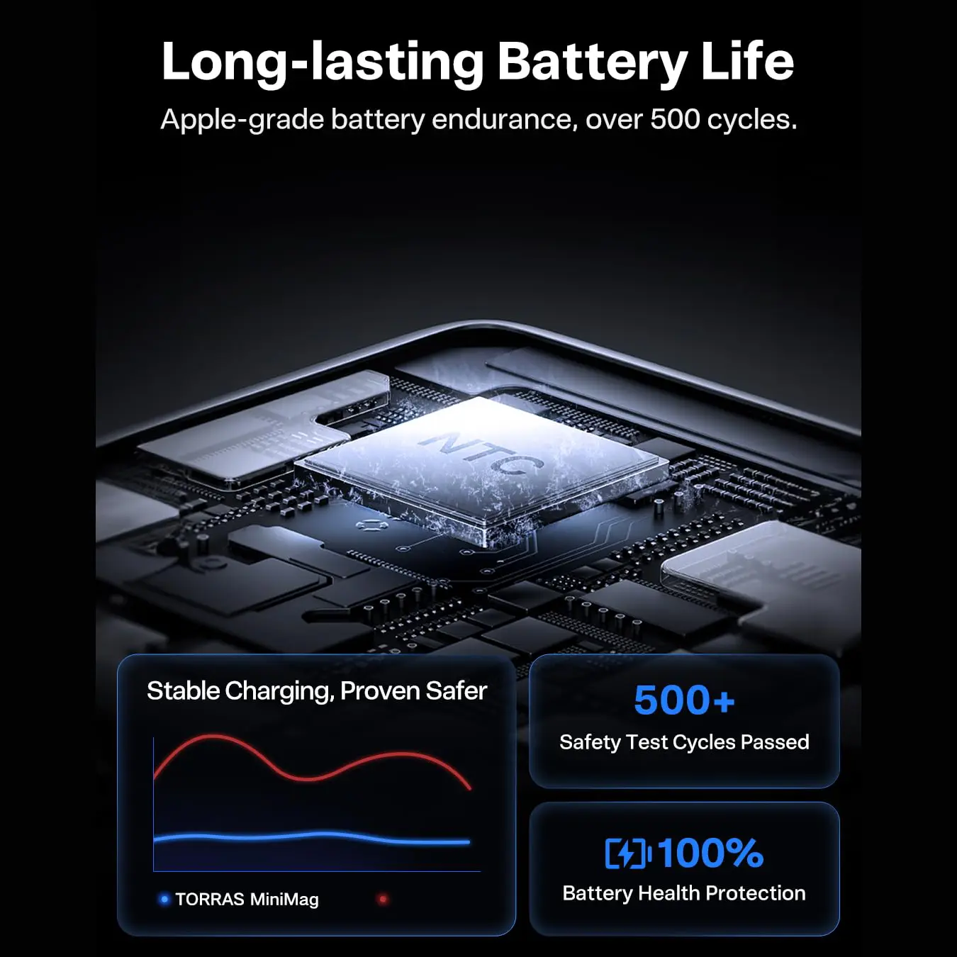 The power bank uses Tesla's same lithium-polymer battery, which is very durable! It can be charged more than 500 times and the battery will not age within 3 years! This means you can use the power bank for a long time without having to replace it! Equipped with advanced safety features like NTC temperature control and overcharge protection, this charger ensures safe charging for your phone. Charge with confidence, knowing your device is in safe hands.