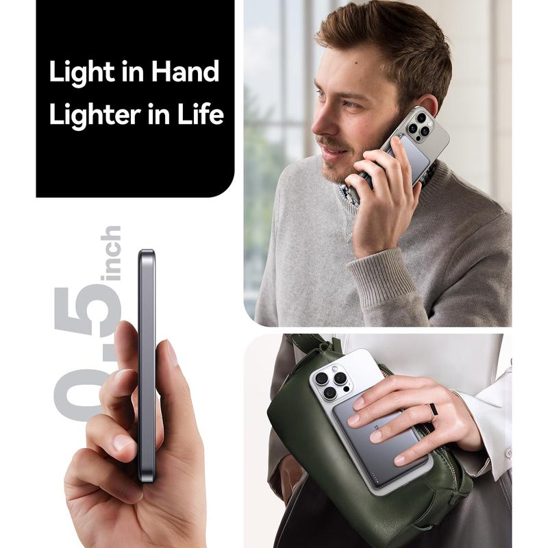 The slim power bank is a portable charger with powerful magnetic attraction, allowing for easy attachment and charging without the need for a charging cable, as there are no cables to fuss with. This makes it incredibly convenient to use and carry! It is compatible with Mag-safe technology and can be used with a variety of magnetic phone cases.