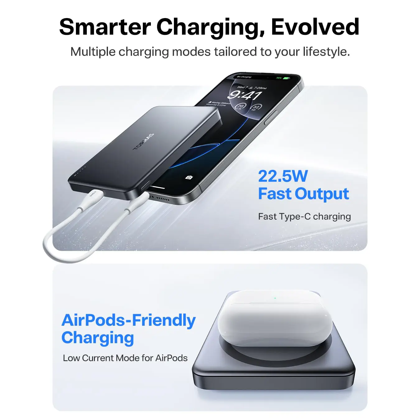 Tired of waiting for your power bank to charge? This power bank fast charging supports 22.5W wired fast charging and 15W wireless fast charging(7.5W wireless charging for iPhone), ensuring your devices can be charged quickly and efficiently. Whether you're on a long trip, a business trip, or away from a power source for extended periods, you never have to worry about running out of battery again.