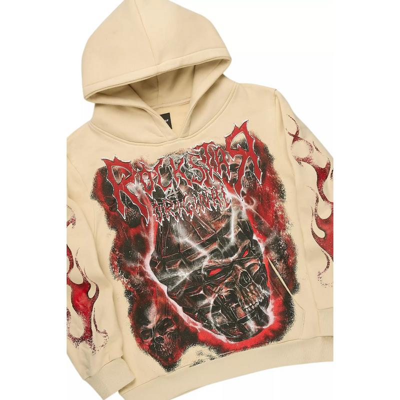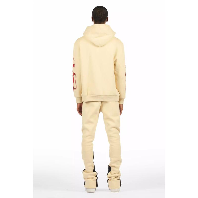 An urban two-piece hoodie and stack track pant set for men in beige. Designed with extra long legs and custom detailing for a must-cop streetwear essential.