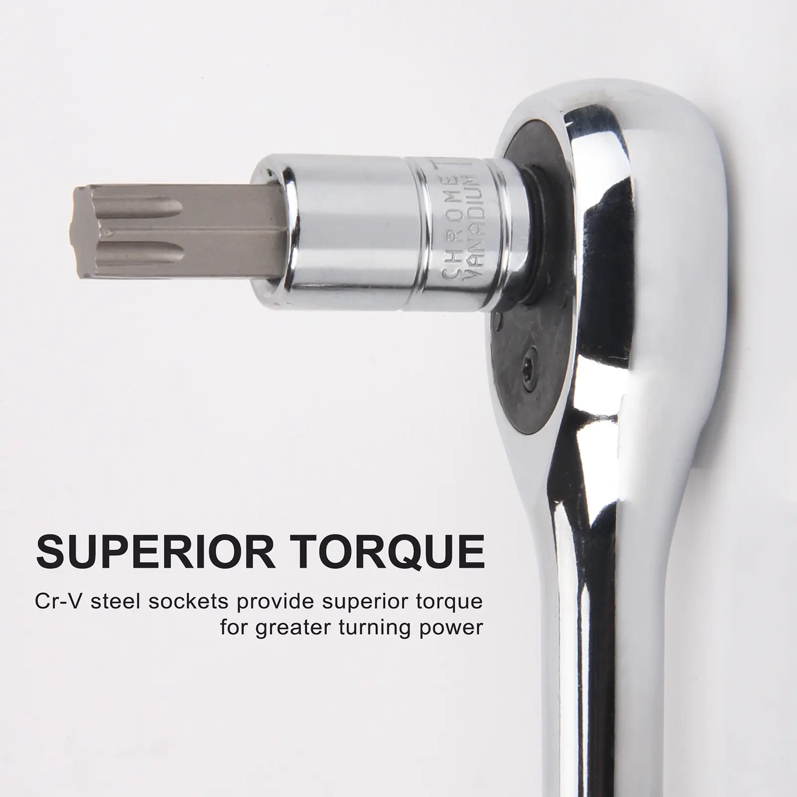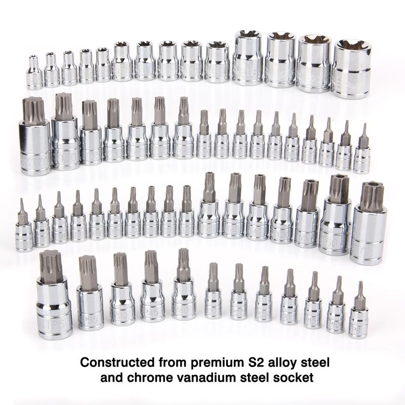 This CASOMAN 60-Piece Master Torx Bit Socket and External Torx Socket Set, It constructed from S2 Steel and chrome vanadium steel (CR-V) for superior strength and longevity, Sockets features a chrome finish and bits are made from S2 steel bits to resist rust and corrosion. The bits is made of S2 steel, which is precisely and automatically machined to ensure accurate size.