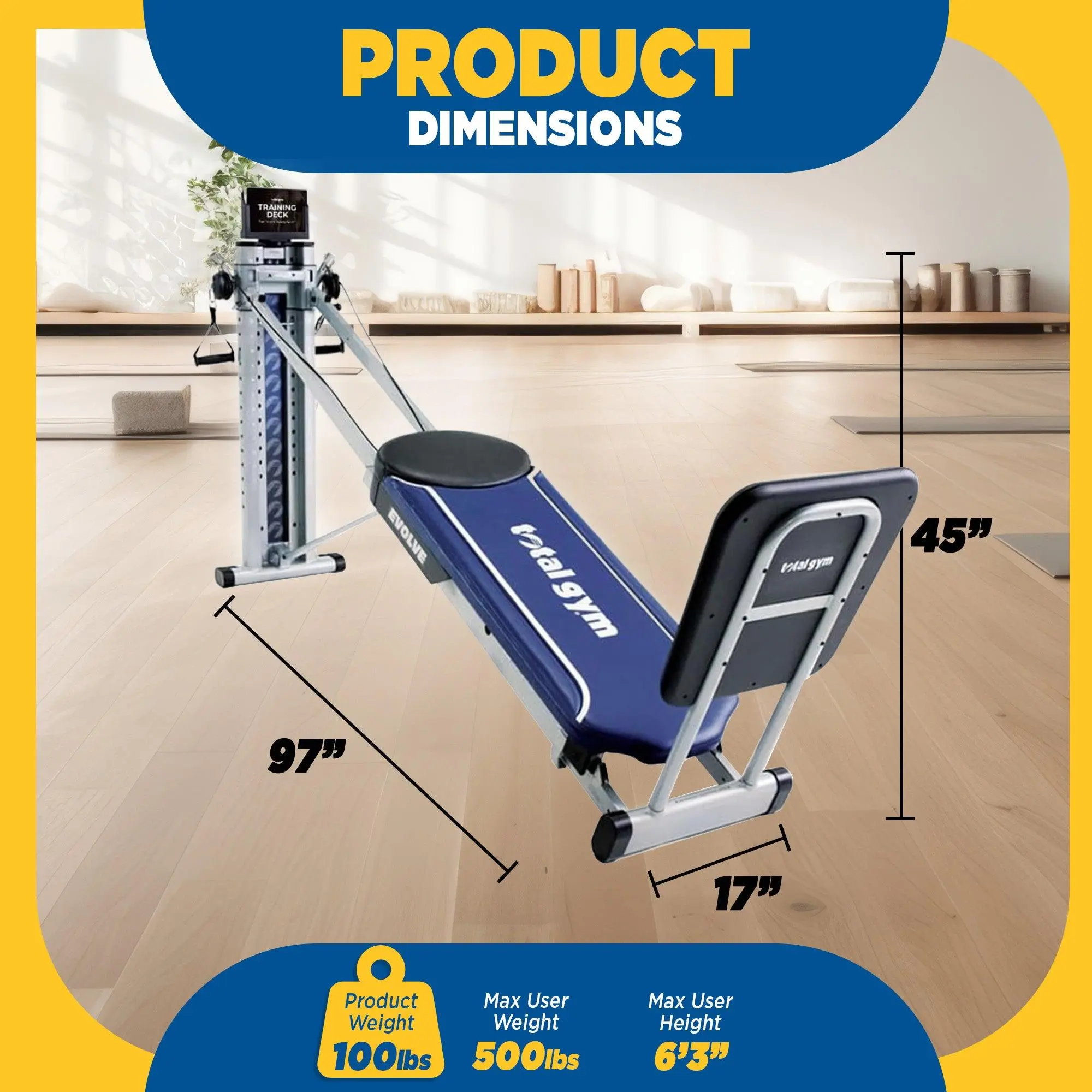 The Total Gym Evolve Full Body Training Home Gym Machine is your ultimate solution for comprehensive home workouts. Engineered for versatility and efficiency, this home gym provides a full-body workout and targets every major muscle group with over 100 unique exercises and 16 resistance levels, combining strength training, cardio, and stretching in one machine. With its unique design, the Total Gym Evolve accommodates all fitness levels, from beginners to advanced users. Crafted with high-quality materials and engineered with a 500-pounds maximum weight capacity, this machine ensures long-lasting durability and reliability, standing up to daily rigorous use. Setting up the Total Gym Evolve is straightforward, with minimal assembly required. Once ready, you can smoothly transition between exercises, thanks to its intuitive design. The included accessories are all designed to provide a seamless workout experience, maximizing your results. When not in use, the machine folds compactly for easy storage, making it perfect for any space. As a trusted name in fitness, Total Gym brings over five decades of expertise to your home. Investing in the Total Gym Evolve means you're choosing a product backed by a brand dedicated to improving your fitness journey. Elevate your home workout routine and achieve your fitness goals with the Total Gym Evolve Full Body Training Home Gym Machine.