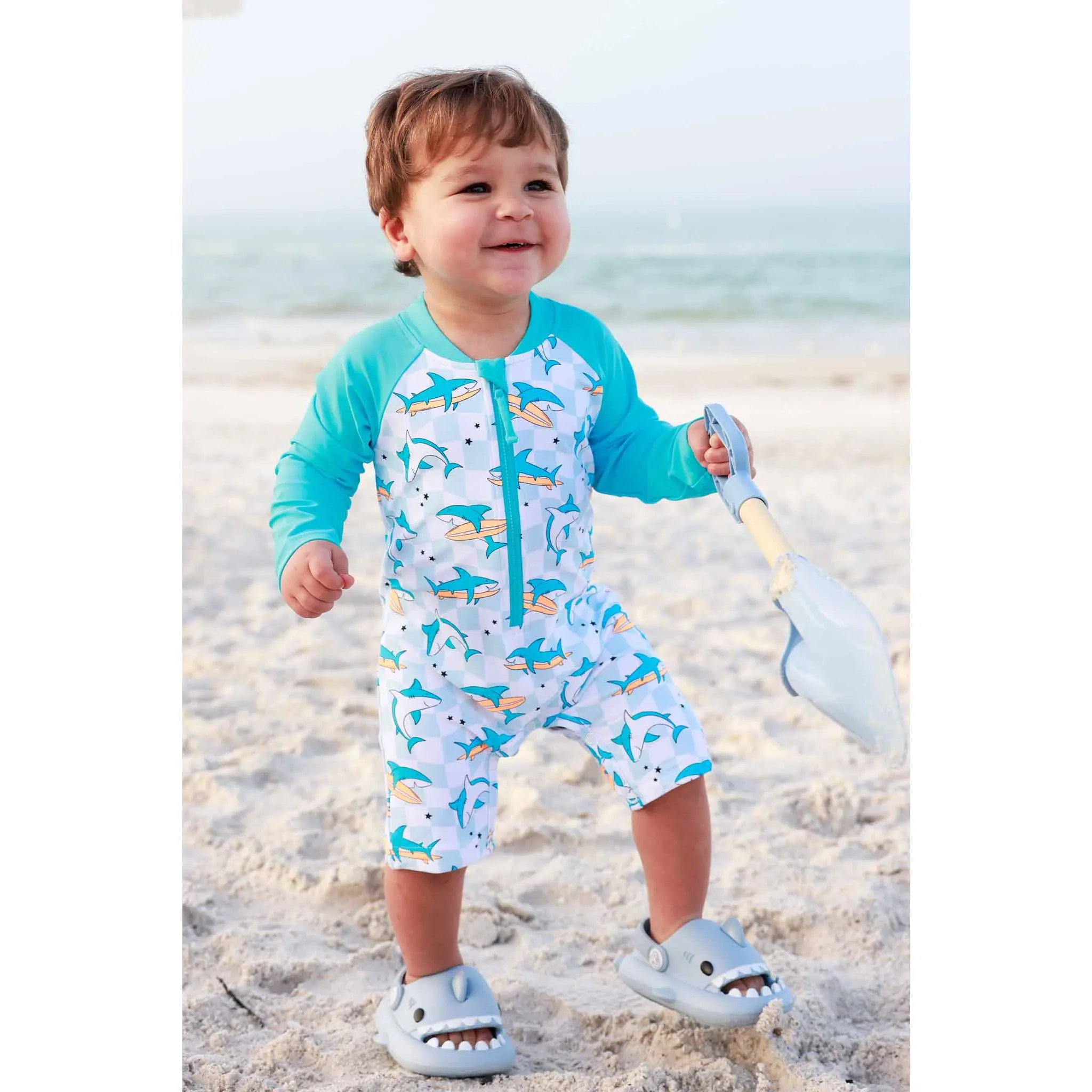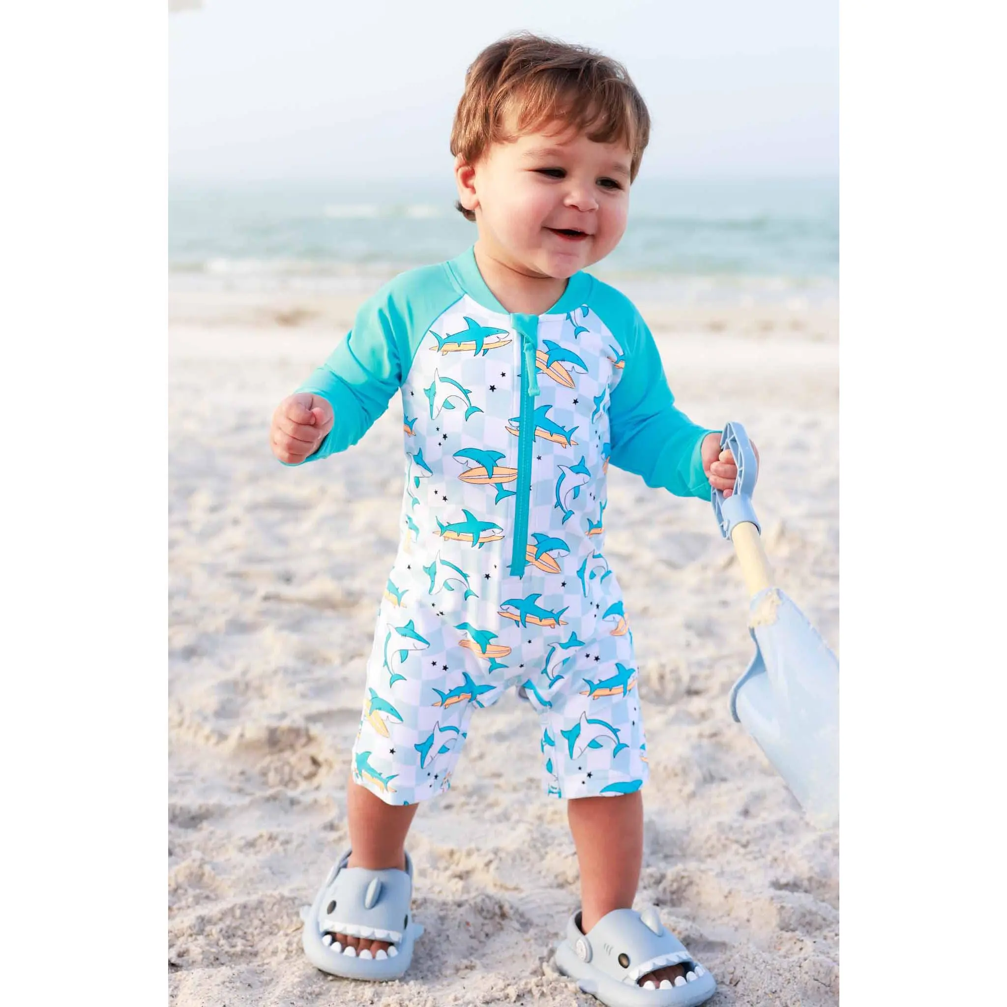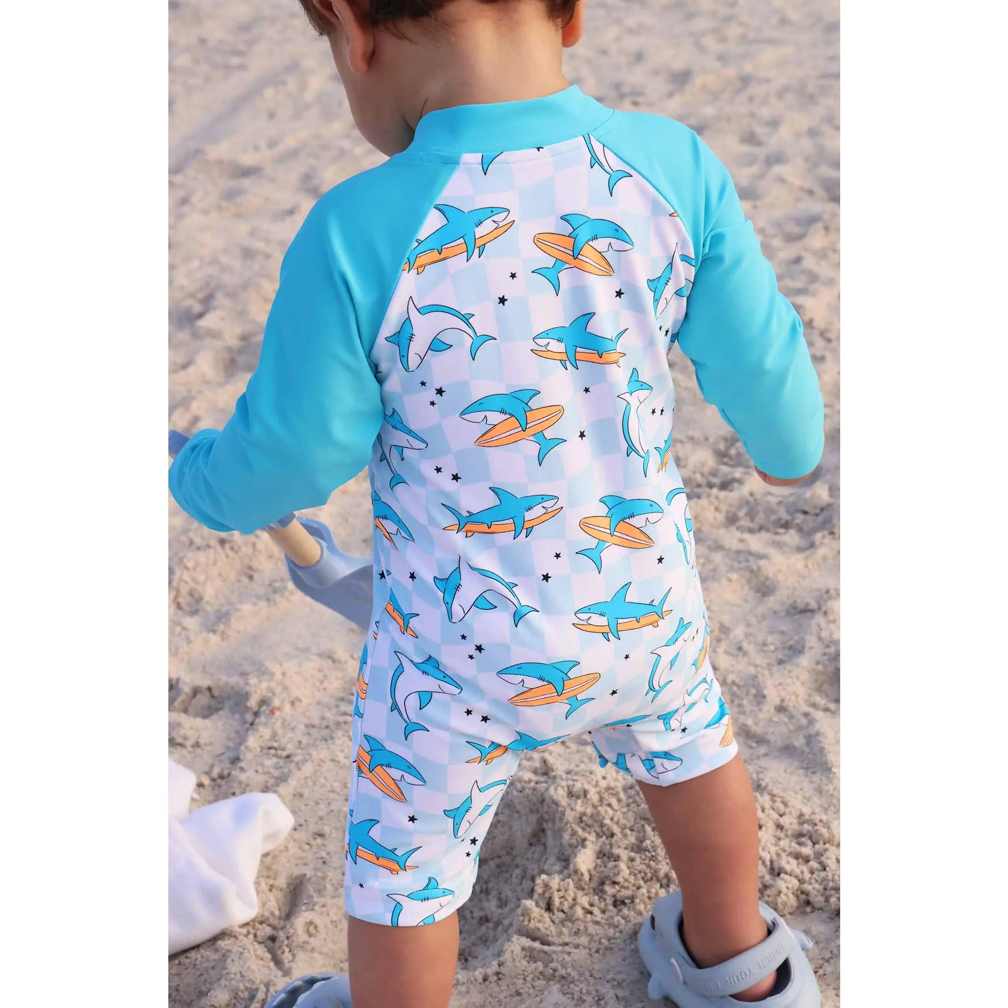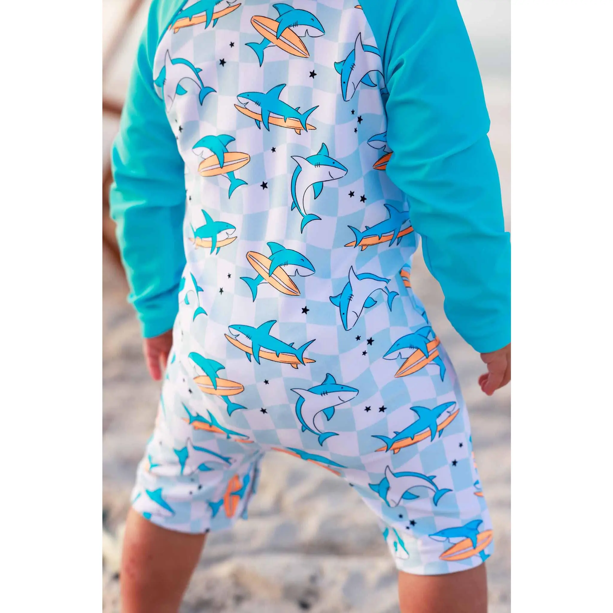 Let the summer fun begin with our Totally Jawsome Long Sleeve Romper Shortie! Covered in playful surfing sharks, this fun-loving print is perfect for little beach explorers who are always ready to dive into their next adventure. With long sleeves and built-in UPF 50+ protection, this romper helps keep delicate skin safe from the sun while they splash, swim, and play all day long. The shortie length keeps things cool and comfy, making it great for pool days, beach trips, and backyard water fun. Easy to wear and made for nonstop movement, this is a swim style that’s as cute as it is convenient.