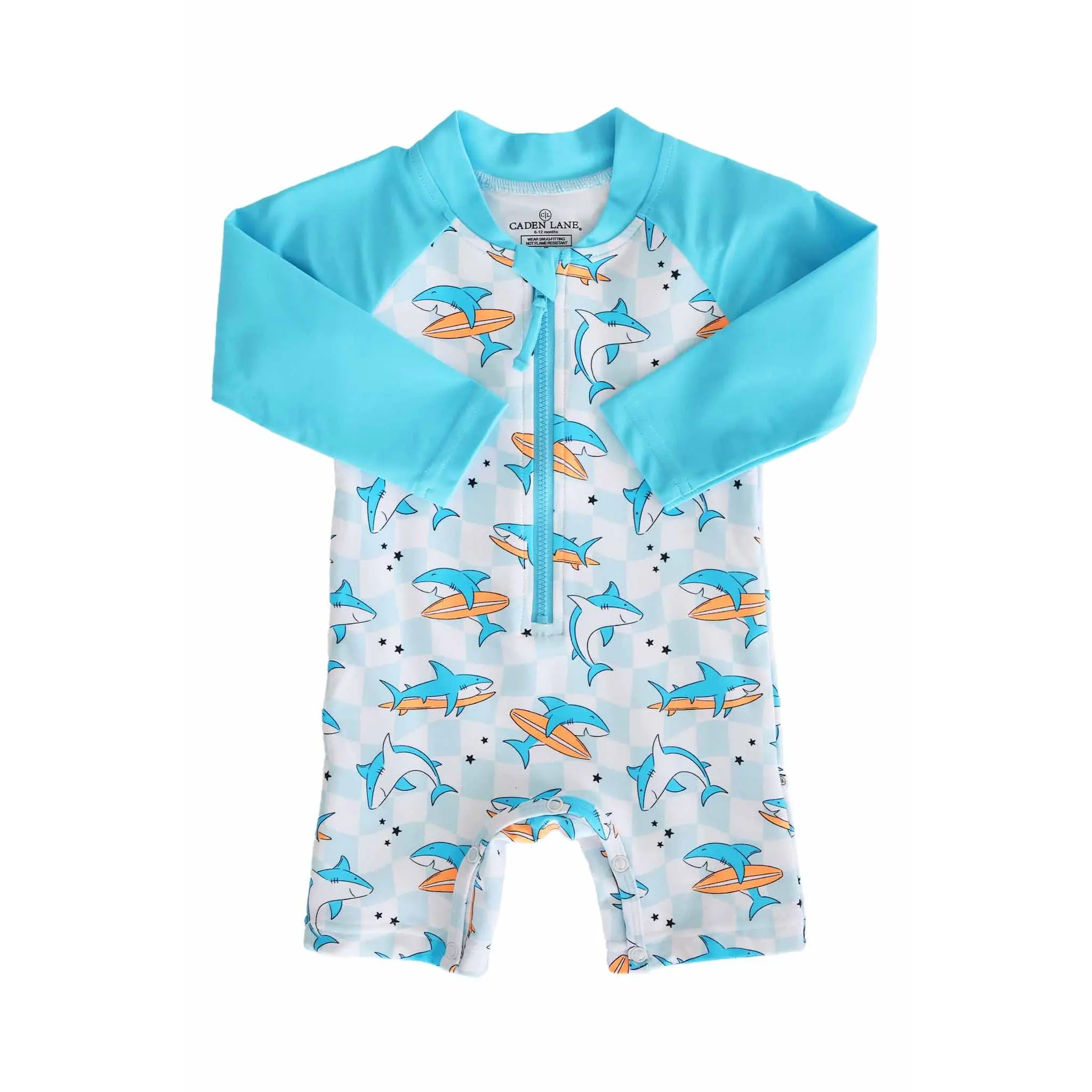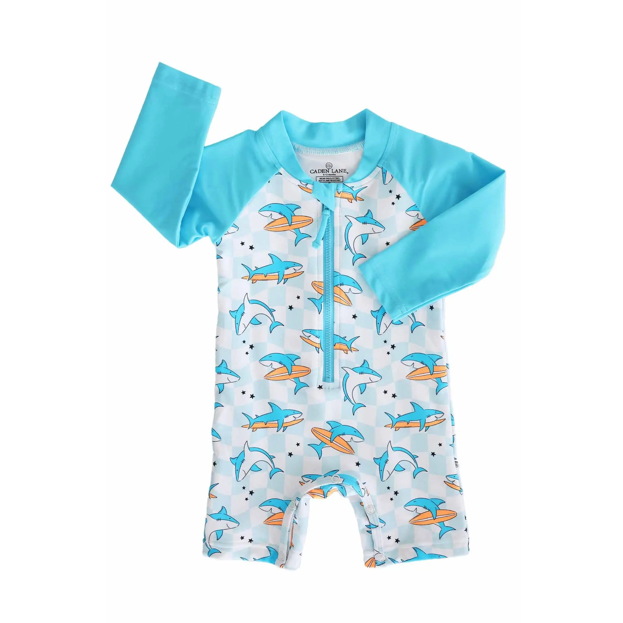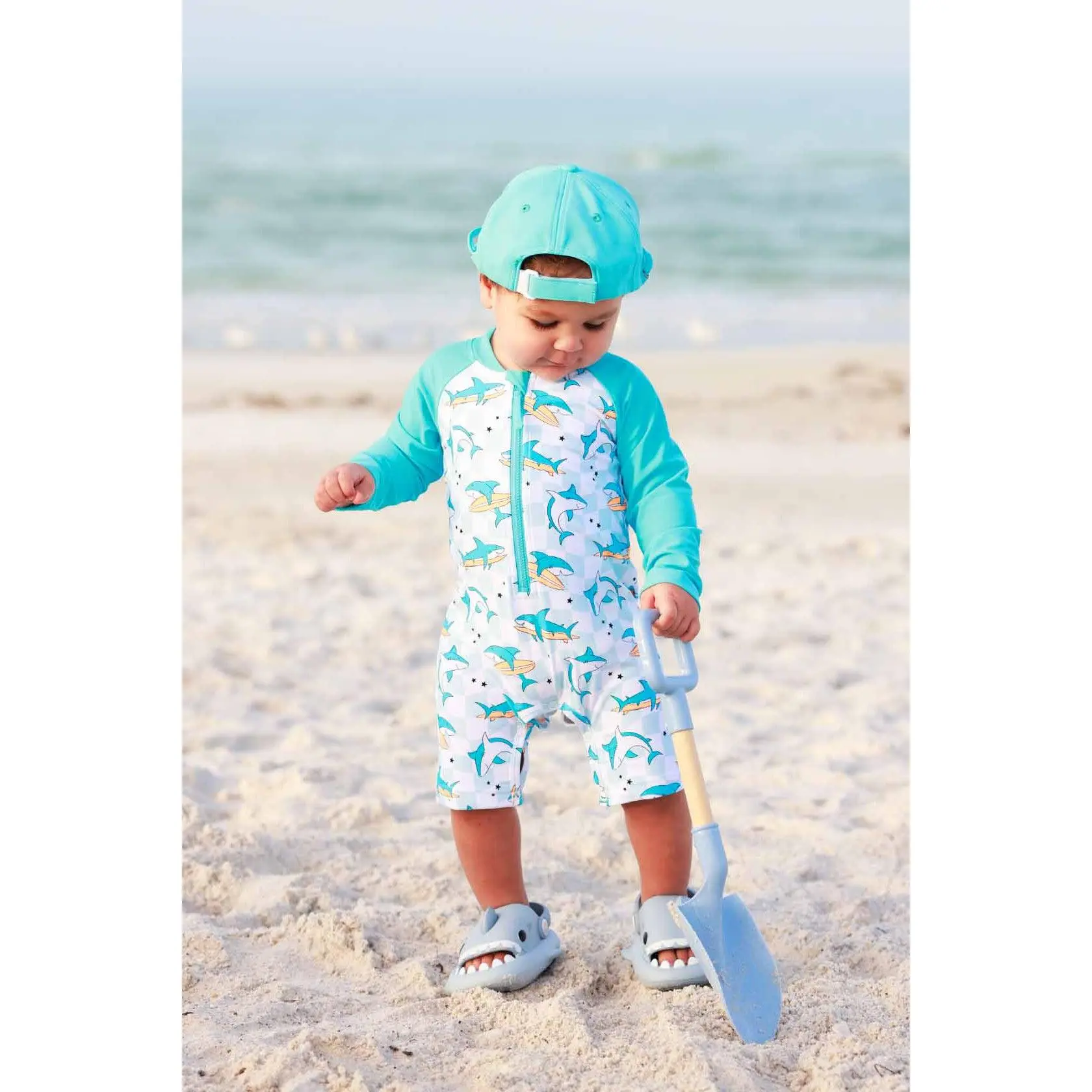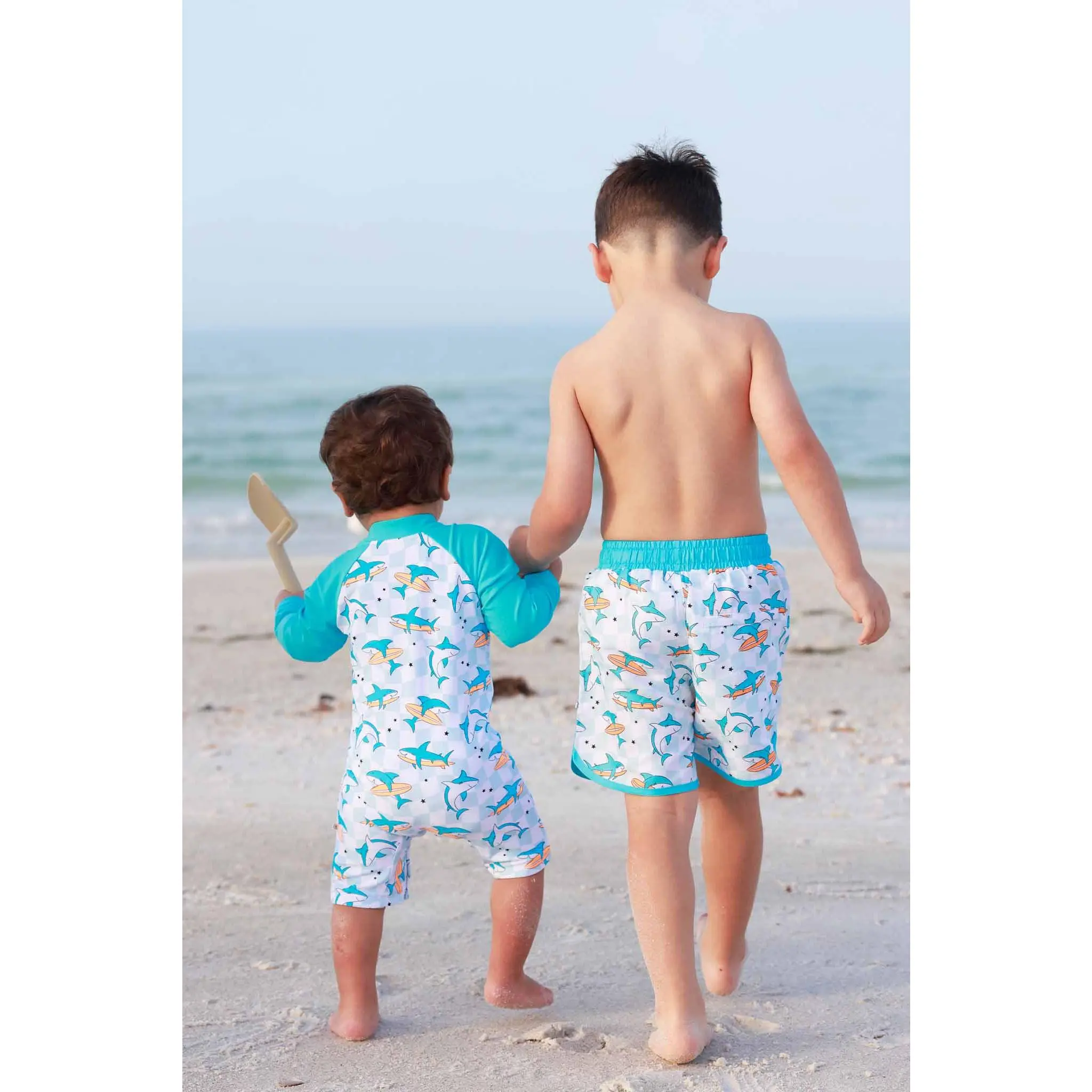 Let the summer fun begin with our Totally Jawsome Long Sleeve Romper Shortie! Covered in playful surfing sharks, this fun-loving print is perfect for little beach explorers who are always ready to dive into their next adventure. With long sleeves and built-in UPF 50+ protection, this romper helps keep delicate skin safe from the sun while they splash, swim, and play all day long. The shortie length keeps things cool and comfy, making it great for pool days, beach trips, and backyard water fun. Easy to wear and made for nonstop movement, this is a swim style that’s as cute as it is convenient.