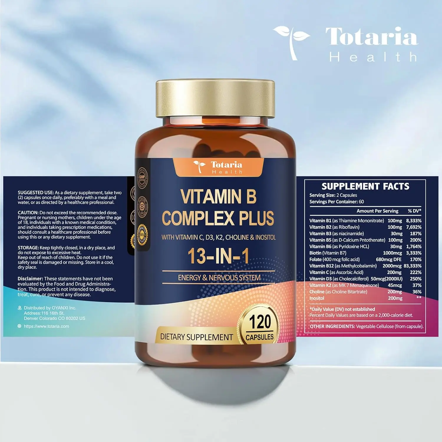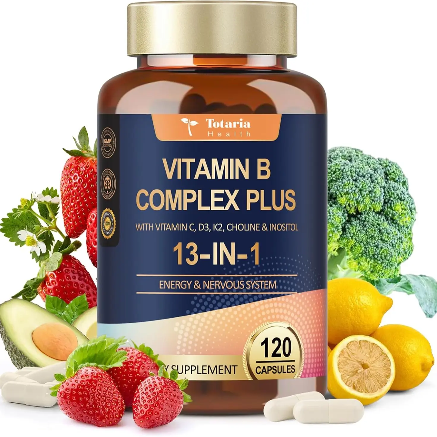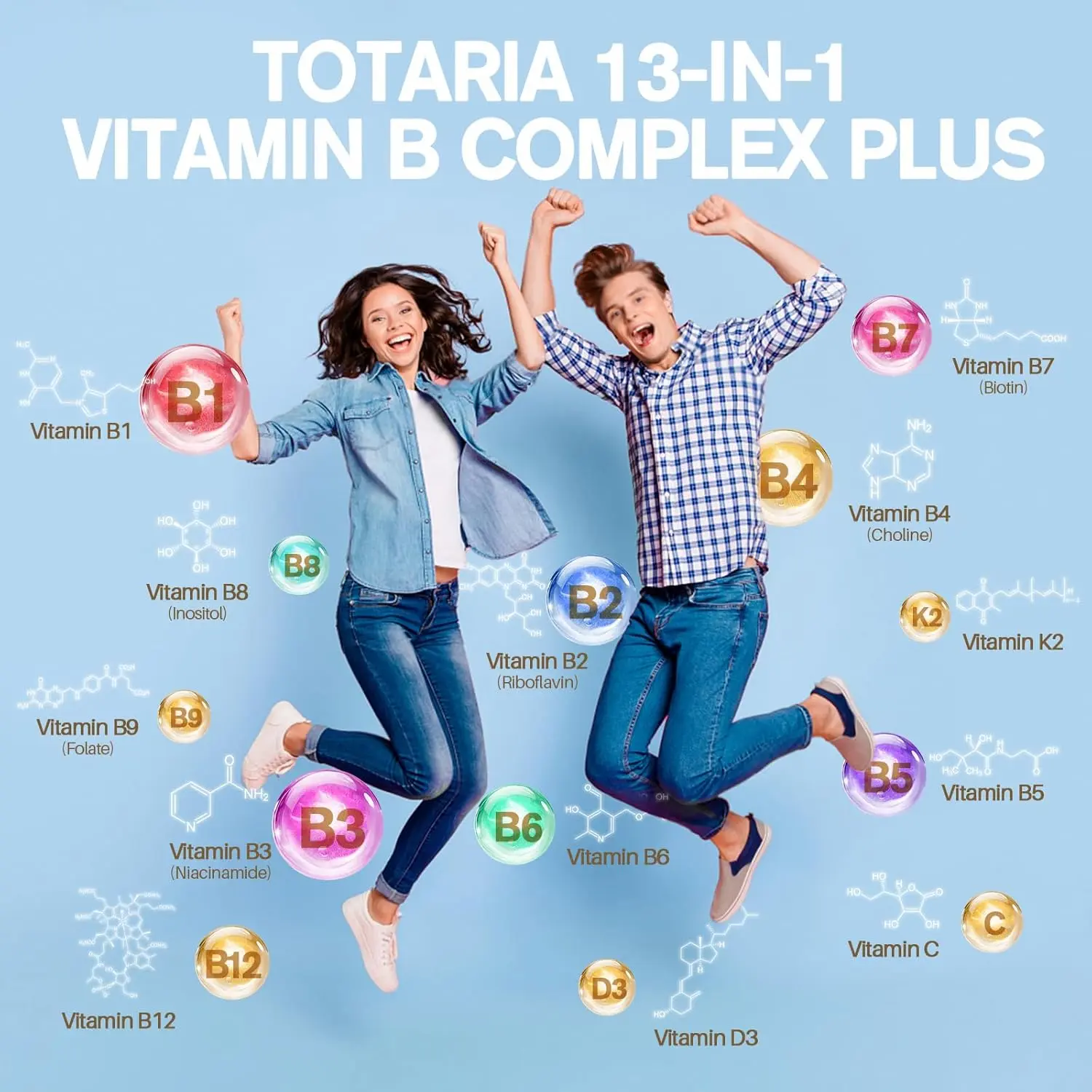 ·VITAMIN B COMPLEX PLUS: Totaria 13-in-1 Vitamin B Complex, containing Complete B Complex: Vitamin B1, Vitamin B2 (Riboflavin), Vitamin B3 (Niacinamide), Vitamin B4 (Choline), Vitamin B5, Vitamin B6, Vitamin B7 (Biotin), Vitamin B8 (Inositol), Vitamin B9 (Folate), Vitamin B12 and Vitamin C, Vitamin D3, Vitamin K2. Super B complex, 13 kinds of vitamins to satisfy your 13 kinds of nutritional supplements.