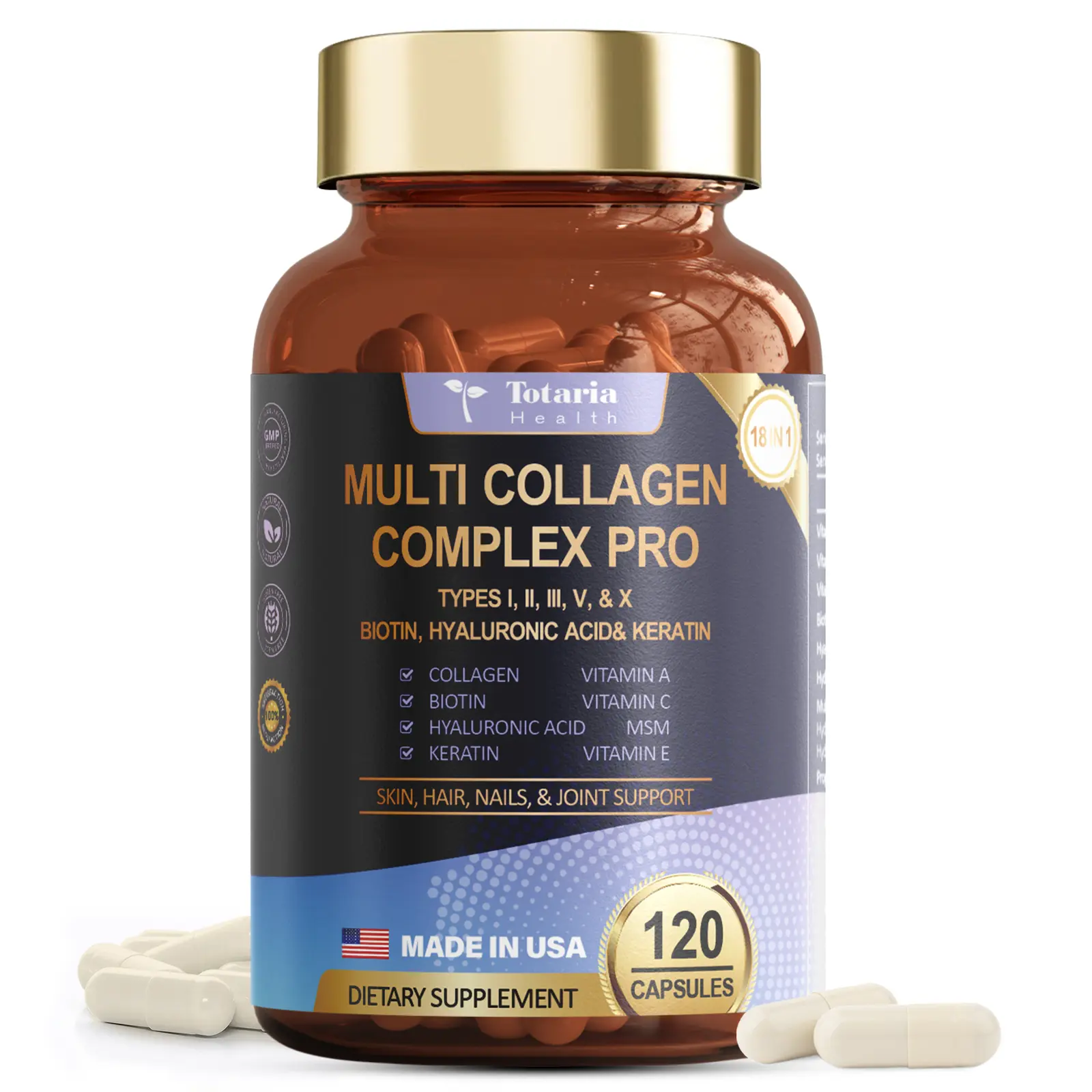 Elevate your supplement regimen with the Totaria 18-in-1 Collagen Pro, designed to support your skin, hair, nails, and joints with a variety of essential nutrients.