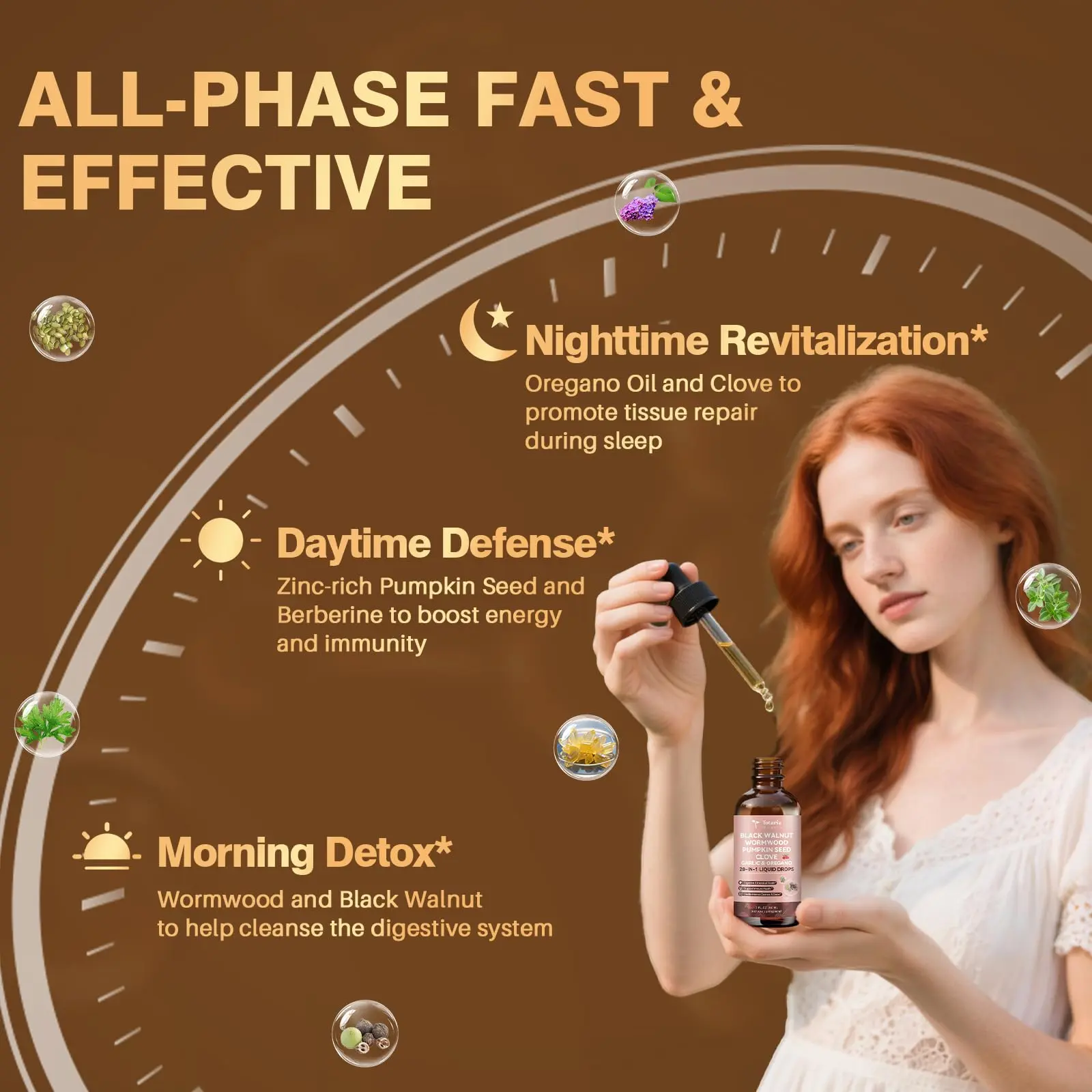Supports gut health with three phases: Morning Detox with Wormwood and Black Walnut, Daytime Defense with zinc-rich Pumpkin Seed and Berberine, and Nighttime Revitalization with Oregano Oil and Clove. It promotes tissue repair during sleep, ensuring your digestive system stays healthy throughout the day.