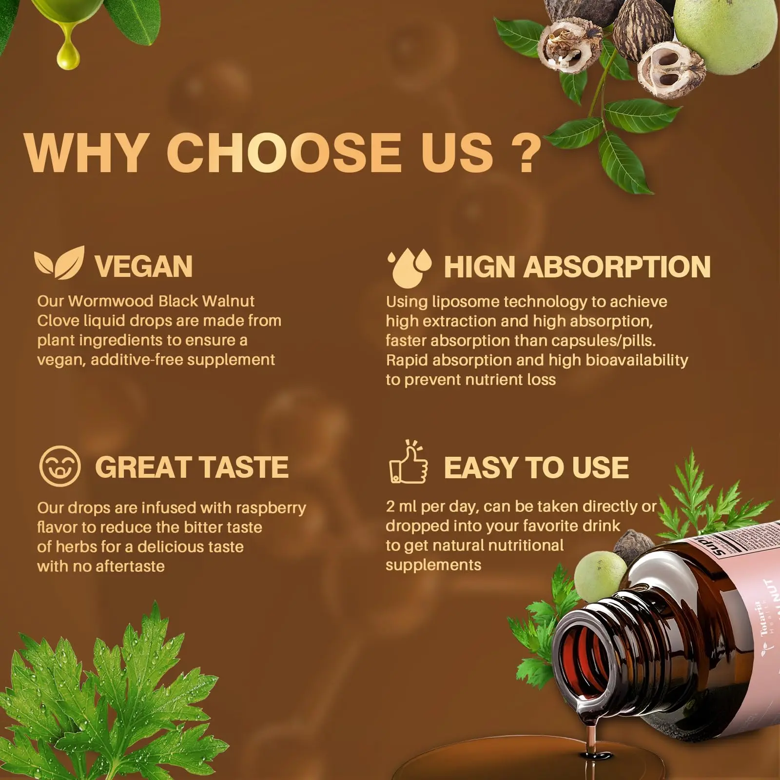 Our black walnut wormwood liquid is a fast and gentle internal detox*. It maintains colon health and relieves constipation. The black walnut wormwood and clove formula is designed for those seeking natural support for overall health and immunity. It's alcohol-free and gut-friendly, ensuring a delicious taste with no aftertaste.